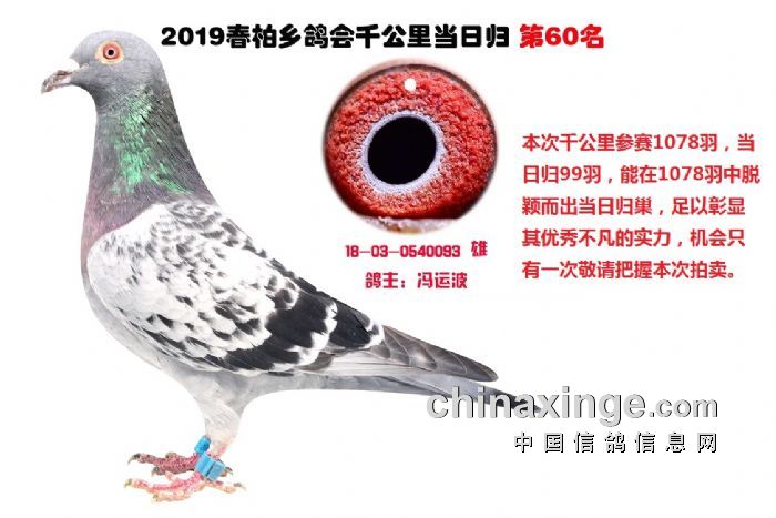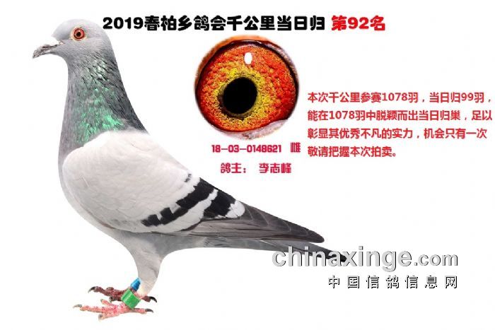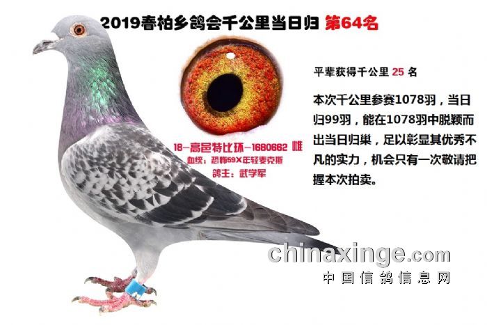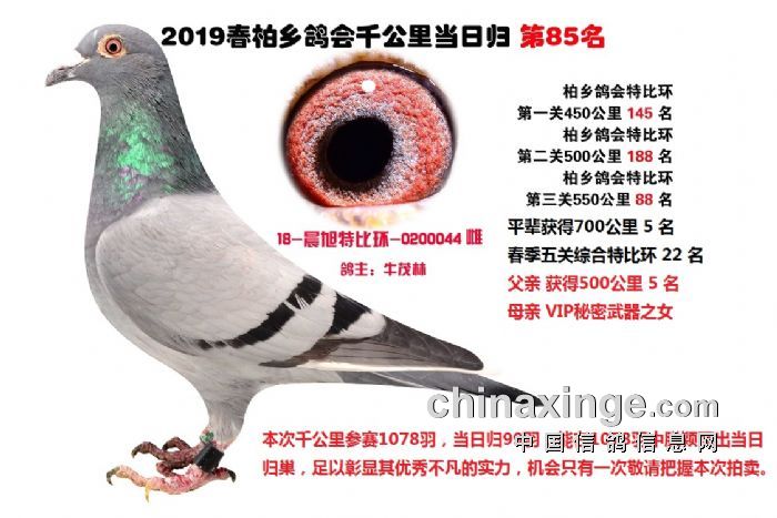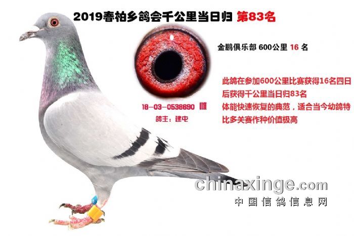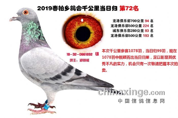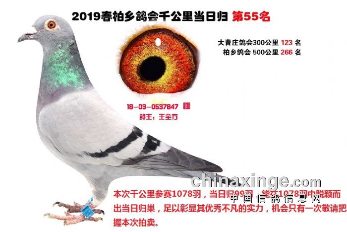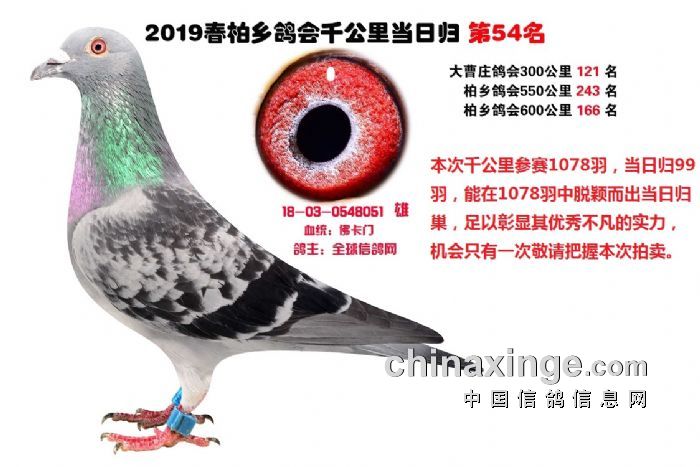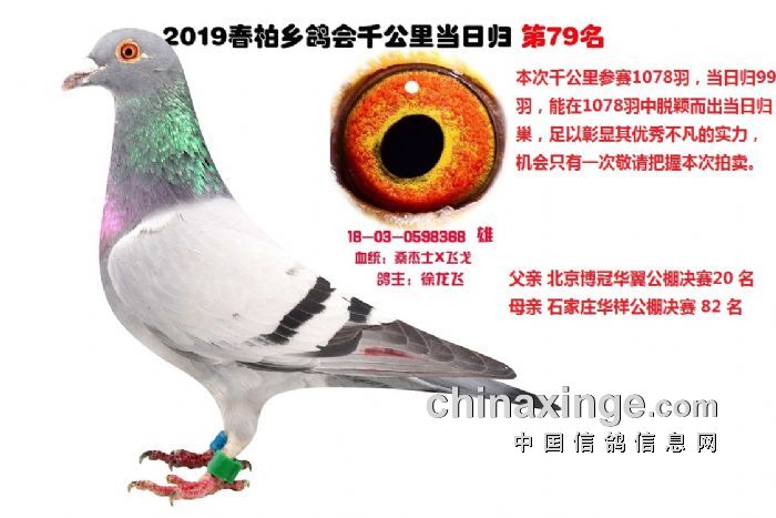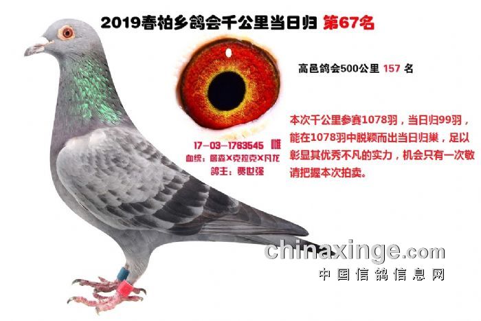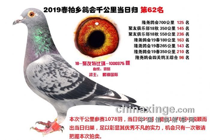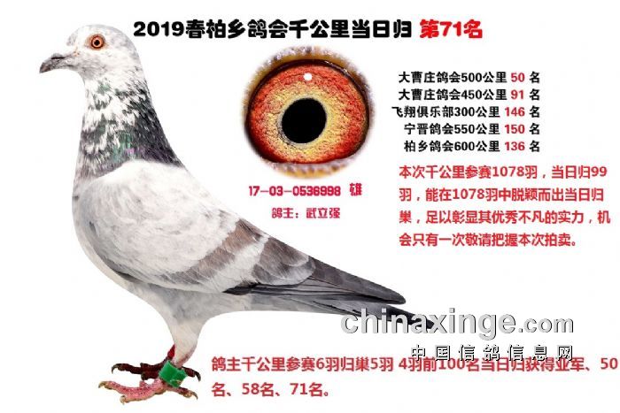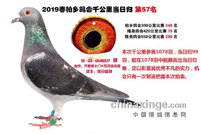 希望全国鸽友珍惜这次千载难逢的机会,因为千公里当日归真正考验优秀赛鸽的品质,可谓浪沙淘金终见金,粗略统计中国各地鸽会组织参加千公里的赛鸽至少20万羽 ,当天归巢寥寥无几,本次拍卖的千公里优胜鸽多次在中距离的比赛中获得高位,再次在千公里拔得头筹证明它是一羽全距离综合素质突出的赛鸽,随着国内赛鸽运动的蓬勃发展。各项赛事的竞争越来越趋于白热化,多关赛赛制是奖金最高的赛事,对于赛鸽综合素质有更高的要求,只能在晴天快速归巢的赛鸽难以能胜任当今幼鸽的多关赛,北京开创者国内最顶级的赛事参赛鸽的水平自不必说,四关鸽王赛,第一关上笼7360羽 第四关上笼654羽 比赛的残酷程度可想而知,千公里当日归强烈的归巢欲望不死必归的信念里素质强大在恶劣天气下定向准确顽强归巢拥有这种特质的种鸽,在你赛鸽夺冠赢取百万奖金路上助你一臂之力