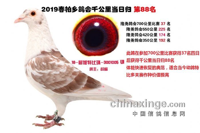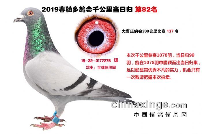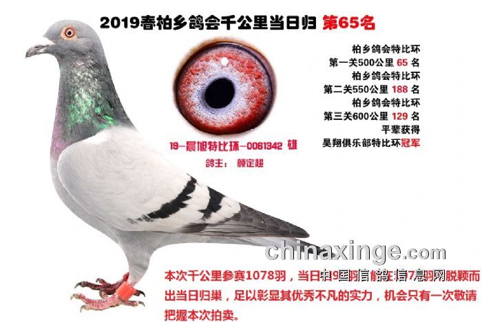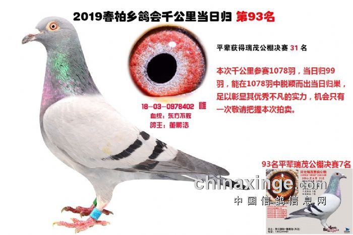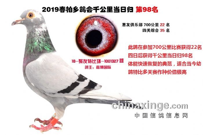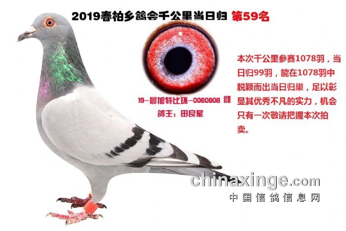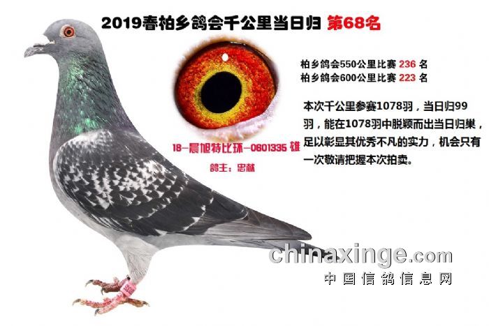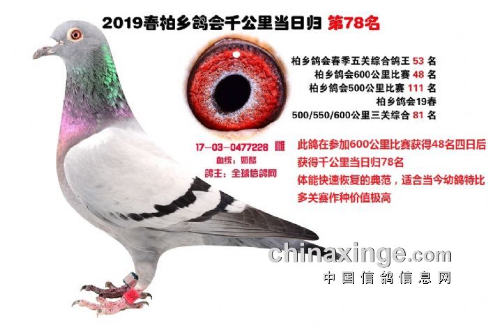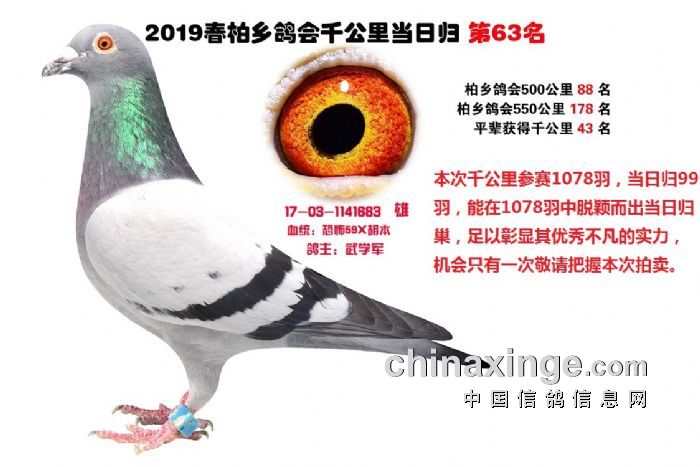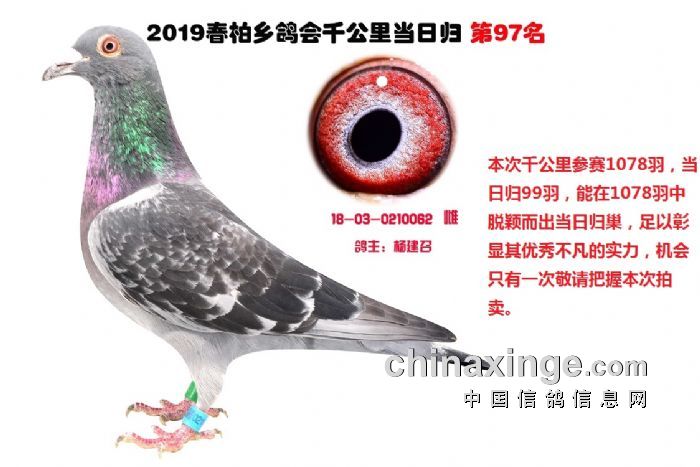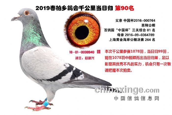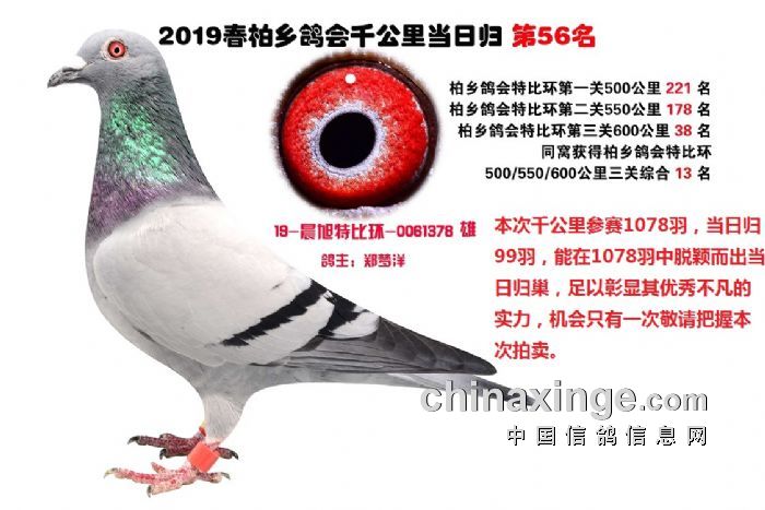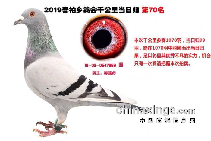 希望全国鸽友珍惜这次千载难逢的机会,因为千公里当日归真正考验优秀赛鸽的品质,可谓浪沙淘金终见金,粗略统计中国各地鸽会组织参加千公里的赛鸽至少20万羽 ,当天归巢寥寥无几,本次拍卖的千公里优胜鸽多次在中距离的比赛中获得高位,再次在千公里拔得头筹证明它是一羽全距离综合素质突出的赛鸽,随着国内赛鸽运动的蓬勃发展。各项赛事的竞争越来越趋于白热化,多关赛赛制是奖金最高的赛事,对于赛鸽综合素质有更高的要求,只能在晴天快速归巢的赛鸽难以能胜任当今幼鸽的多关赛,北京开创者国内最顶级的赛事参赛鸽的水平自不必说,四关鸽王赛,第一关上笼7360羽 第四关上笼654羽 比赛的残酷程度可想而知,千公里当日归强烈的归巢欲望不死必归的信念里素质强大在恶劣天气下定向准确顽强归巢拥有这种特质的种鸽,在你赛鸽夺冠赢取百万奖金路上助你一臂之力