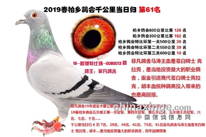 柏乡信鸽协会第四届千公里经典品牌赛事圆满结束,为了体现比赛的公正性 透明度 由邢台市信鸽协会委派国家一级裁判监督集鸽全部过程,放飞地由湖南汨罗信鸽协会监督开笼 1078羽中距离精英历经五关鸽王洗礼后再次踏上千公里的征程,由于天气原因提前了集鸽时间 距五关鸽王最后一关600公里结束只有四天的时间,对赛鸽体能快速恢复可以说是极限挑战 4月17日6点18分在湖南平江开笼 ,当天归巢99羽突破国内历史记录,全球公认含金量最高的巴塞罗那国际千公里赛事,千公里当日归高位获奖鸽价格非常昂贵均在百万以上,03年中国阳光家园巨资将巴塞罗那冠军中国一号”、亚军“中国二号”引进国内后,后代极度发挥在各项赛事中斩获奖金近千万,97年上海千公里当日归被国外鸽友10万收购,足见当时国外鸽友对千公里当日归的育种价值比国内鸽友更有预见性,本次千公里当日归的99羽精英在将近十一个小时翅膀不停的煽动强烈的归巢欲望将近一千羽对手远远甩在后面千公里当日归是平庸赛鸽无法逾越屏障,