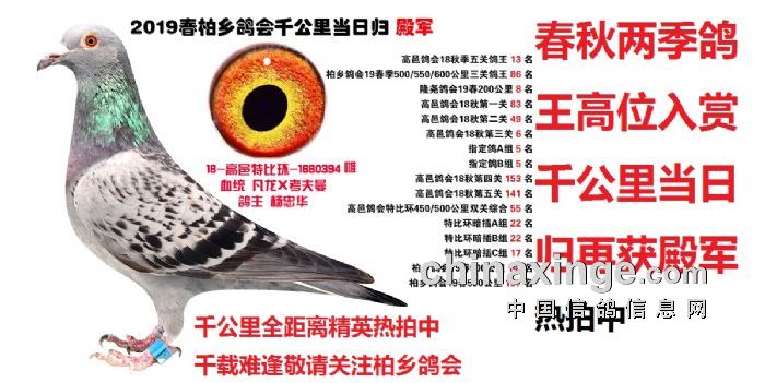 柏乡鸽会千公里能够得到全国鸽友的认可最大的因素是这些千公里优胜鸽通过网拍在全国安家落户后其后代很快展露头角为新主人挣得荣誉尤其是恶劣天气归巢率低 分速低 的情况下优势非常明显在 北京 云南 内蒙 贵州 山西 甘肃 ,江苏,…………作出的后代为新主人挣得荣誉赢取丰厚奖金,这些身经百战,成绩优异的实战赛绩鸽必将在你赛鸽夺冠路上给你带来意想不到的惊喜,赛鸽这项运动并不复杂,凡龙,和英格斯都说过一句同样的话,必须拥有最好的种鸽,好鸽自己就会赢,只要你有拥有极具速度的种鸽,你一样可以成为鸽界强豪傲视鸽坛名利双收。