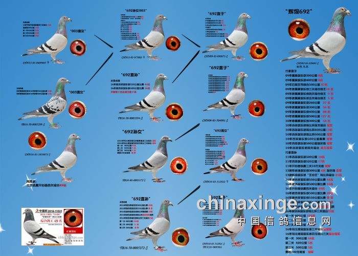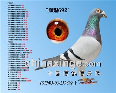 希望全国鸽友珍惜这次千载难逢的机会,因为千公里当日归真正考验优秀赛鸽的品质,可谓浪沙淘金终见金,粗略统计中国各地鸽会组织参加千公里的赛鸽至少20万羽 ,当天归巢寥寥无几,本次拍卖的千公里优胜鸽多次在中距离的比赛中获得高位,再次在千公里拔得头筹证明它是一羽全距离综合素质突出的赛鸽,随着国内赛鸽运动的蓬勃发展。各项赛事的竞争越来越趋于白热化,多关赛赛制是奖金最高的赛事,对于赛鸽综合素质有更高的要求,只能在晴天快速归巢的赛鸽难以能胜任当今幼鸽的多关赛,北京开创者国内最顶级的赛事参赛鸽的水平自不必说,四关鸽王赛,第一关上笼7360羽 第四关上笼654羽 比赛的残酷程度可想而知,千公里当日归强烈的归巢欲望不死必归的信念里素质强大在恶劣天气下定向准确顽强归巢拥有这种特质的种鸽,在你赛鸽夺冠赢取百万奖金路上助你一臂之力