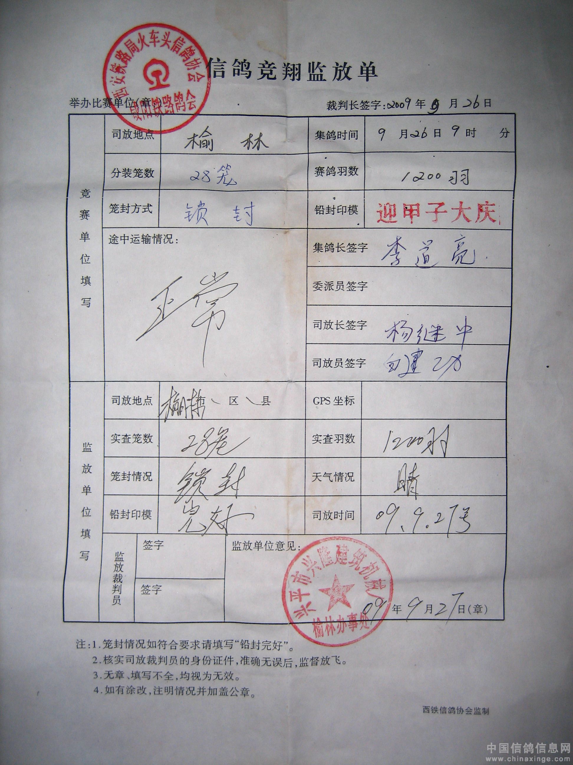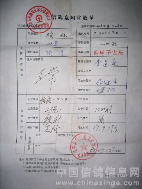 陕西榆林450公里信鸽赛监放单