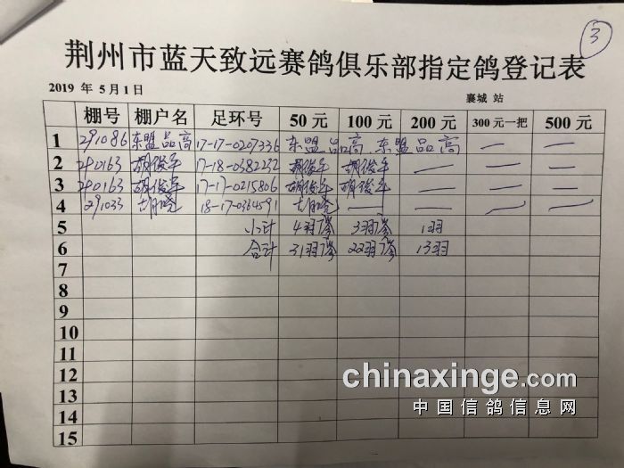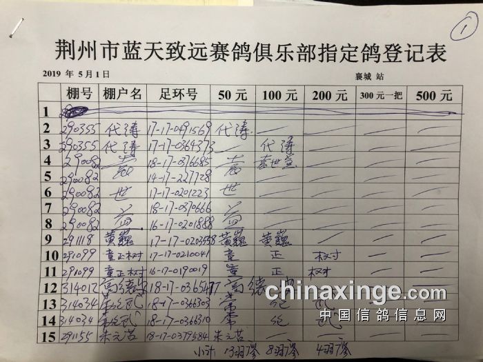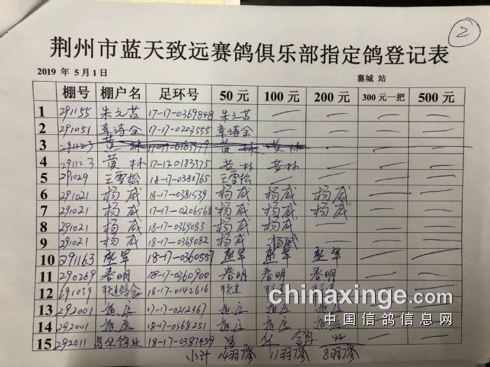 2019年春5月1日400公里襄城站比赛指定鸽明细