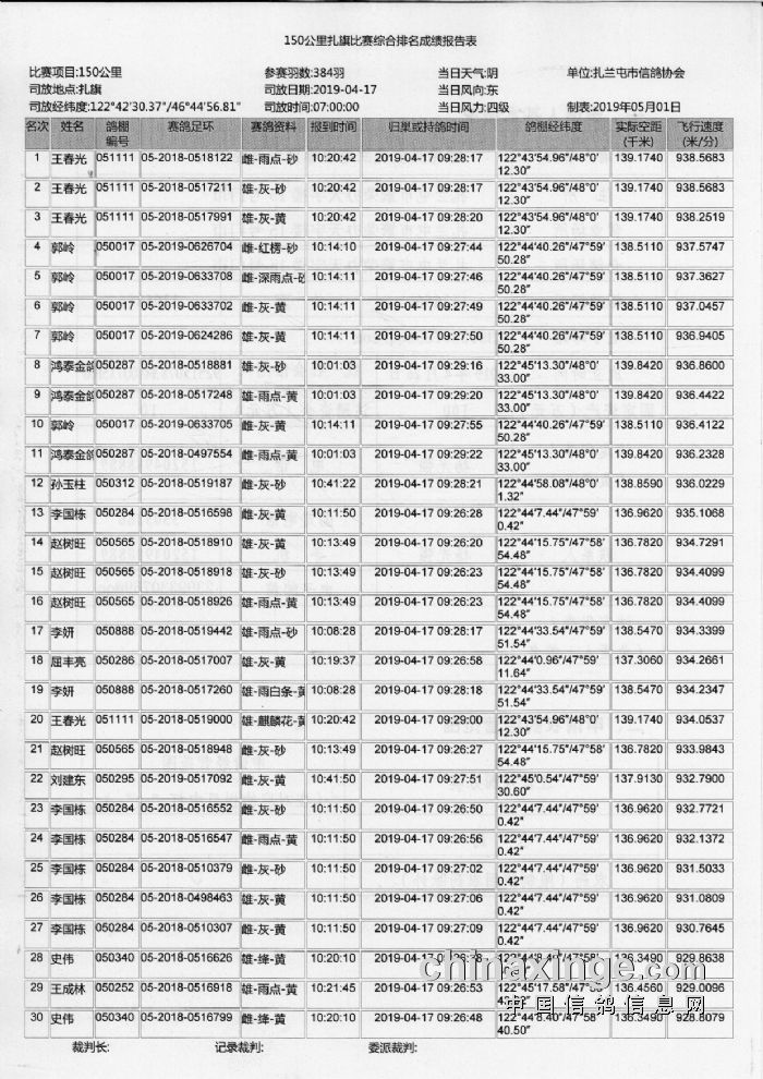 第二十三届中国信鸽 国家赛“ 锡林浩特赛区”成绩报告表