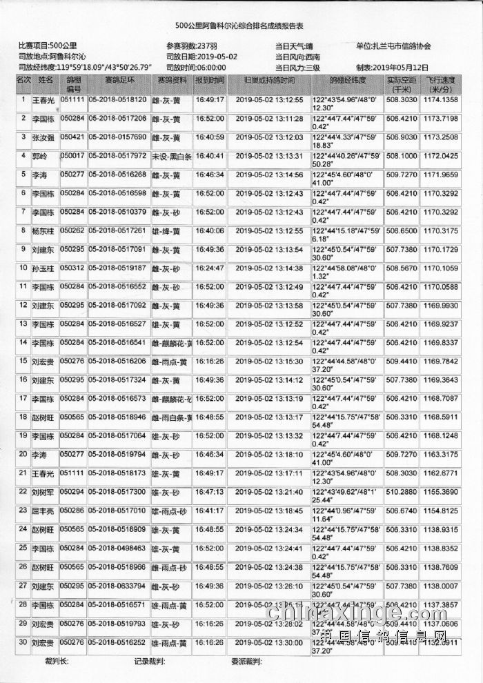 第二十三届中国信鸽 国家赛“ 锡林浩特赛区”成绩报告表