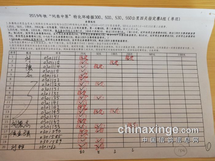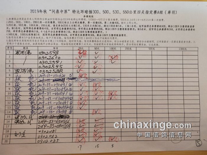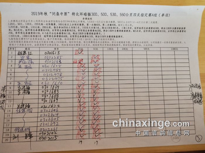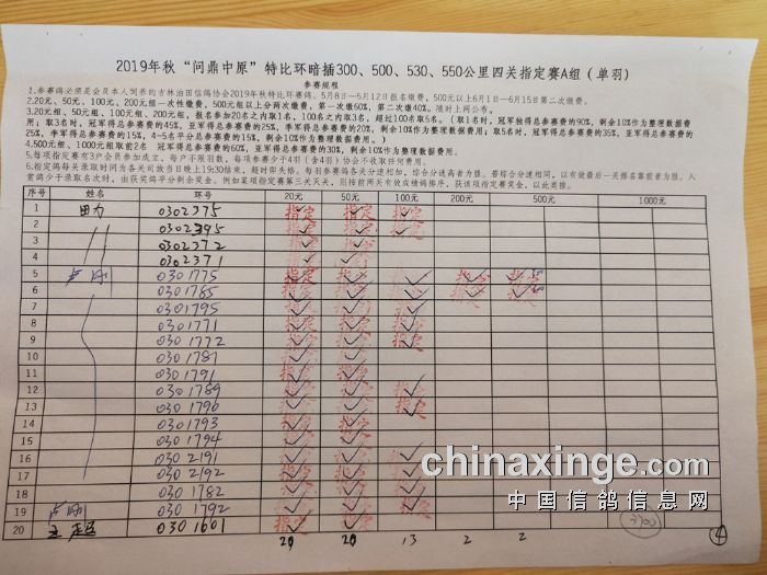 2019年秋特比环暗插300、500、530、550公里四关指定鸽赛单羽A组1