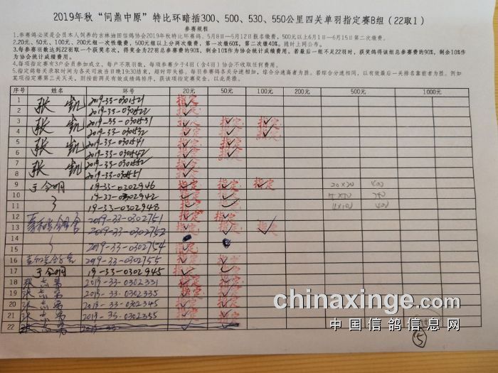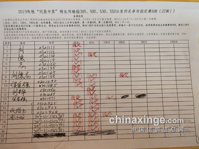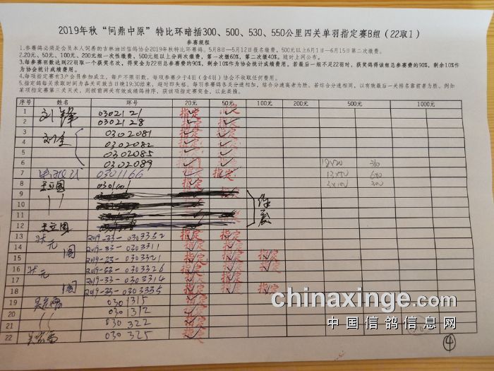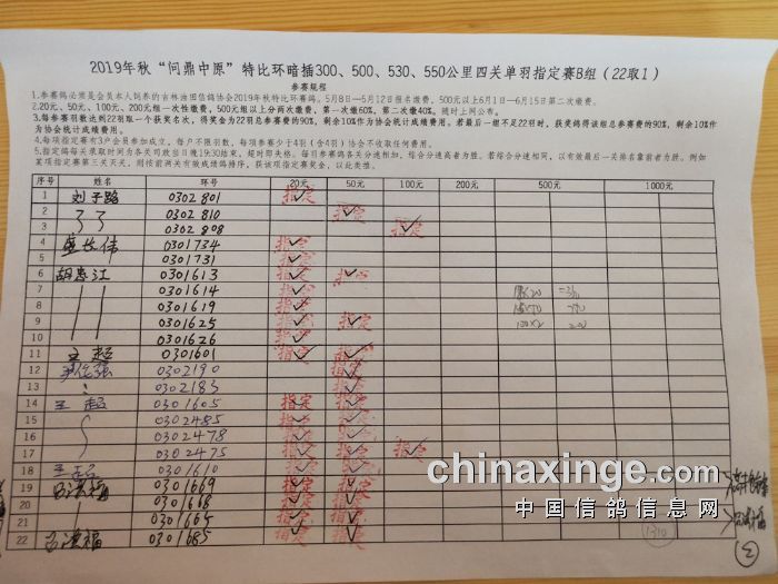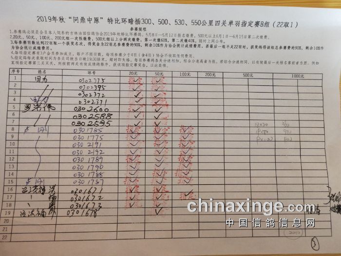 2019年秋特比环暗插300、500、530、550公里四关指定鸽赛单羽B组1