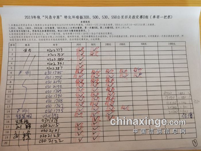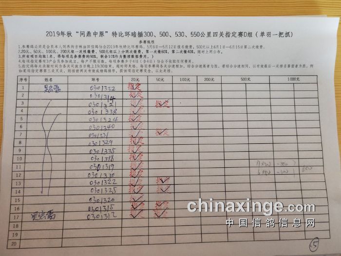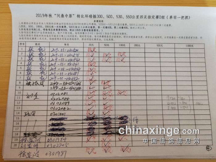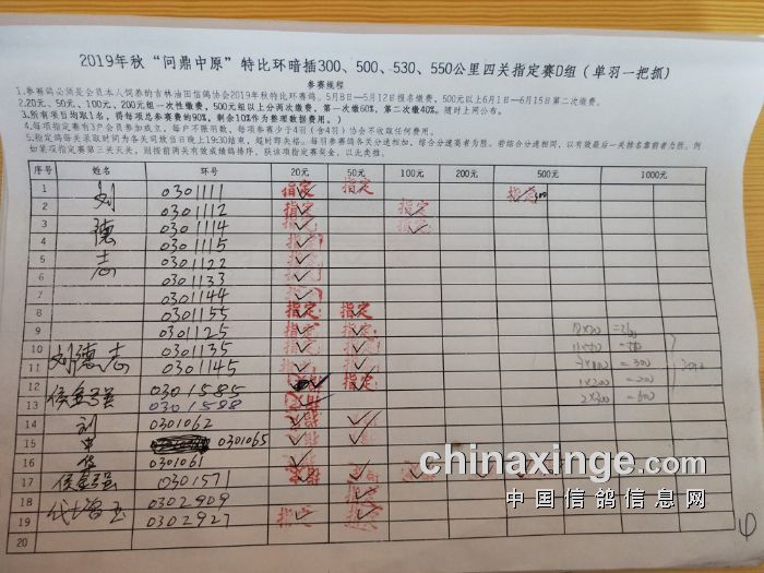 2019年秋特比环暗插300、500、530、550公里四关指定鸽赛单羽D组1