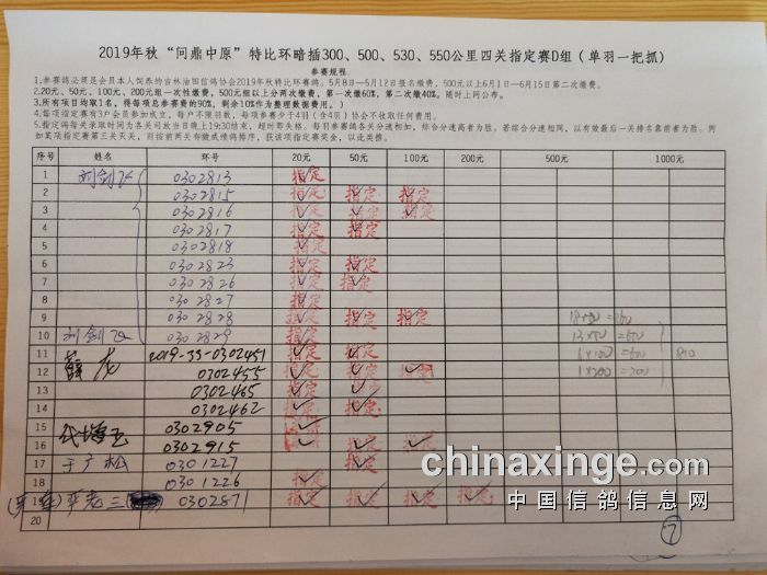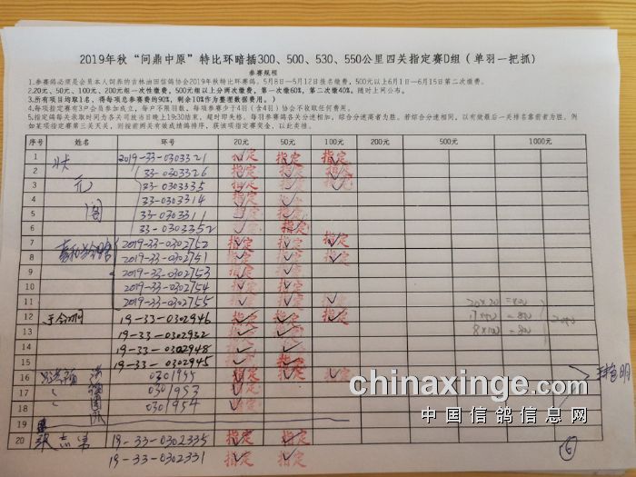 2019年秋特比环暗插300、500、530、550公里四关指定鸽赛单羽D组2