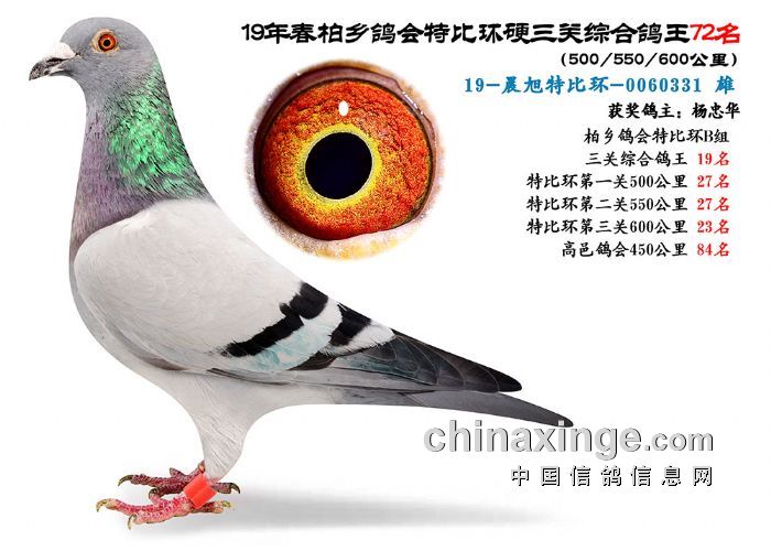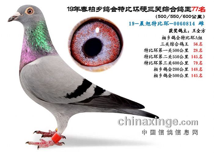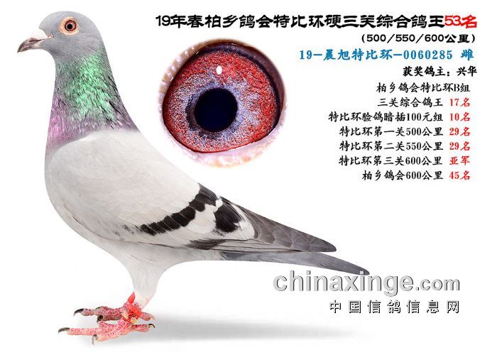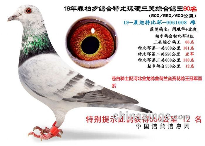 19春柏乡鸽会三关综合鸽王季军四次鸽王高位入赏后再次获得五关鸽王总冠军,参加本次拍卖的春赛特比环硬三关综合鸽王前100名,3月26日第一关500公里到4月11日第三关600公里结束短短15天的时间完成1650公里的赛程。对幼鸽的体能的快速恢复能力是极大的考验,作为种鸽这种特质更适合当今幼鸽多关