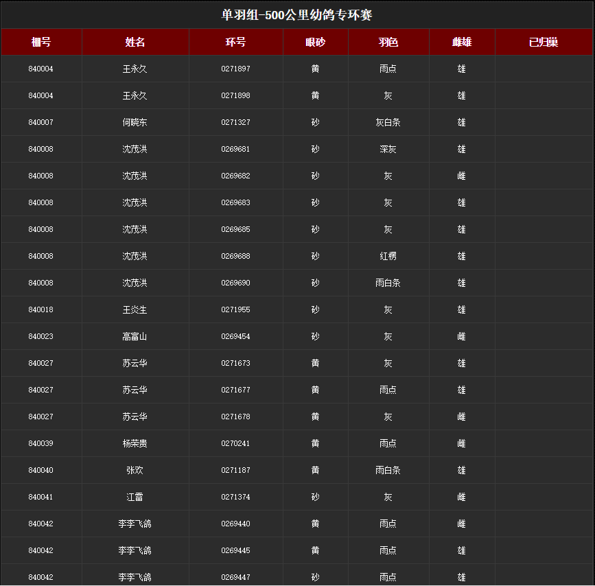 2019年春500公里幼鸽专环上笼明细