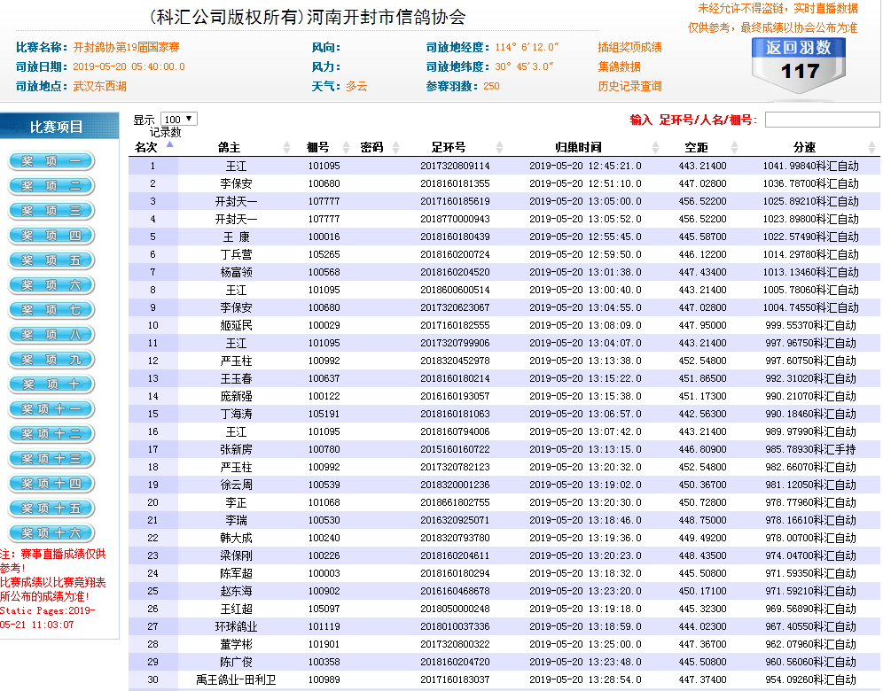 2025年第25届国家信鸽比赛武汉赛区本市成绩