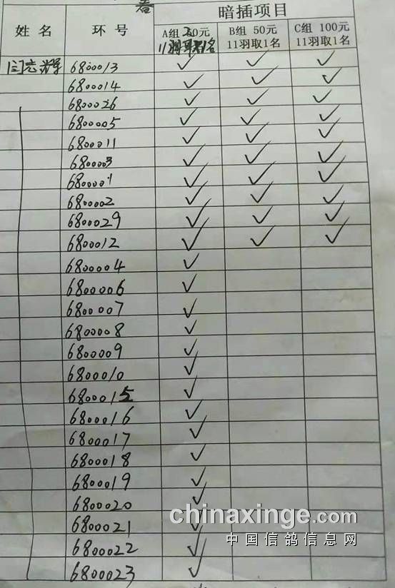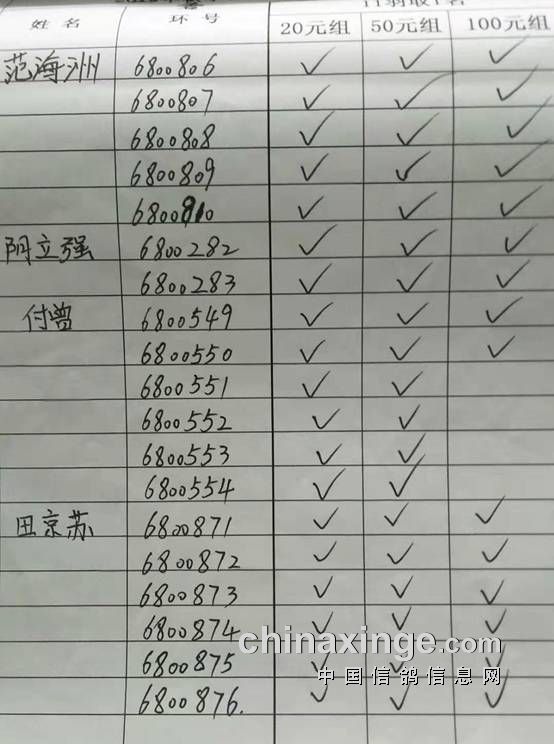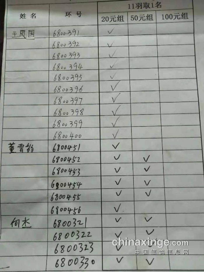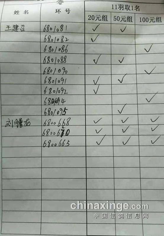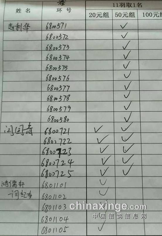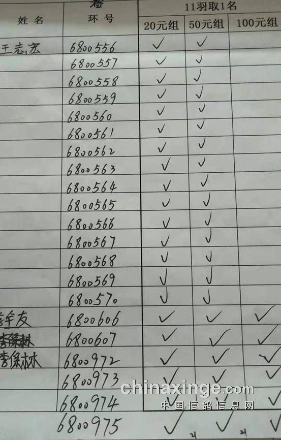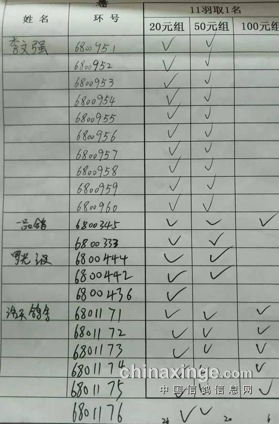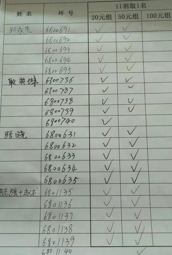 50元组共指定135羽,取前13名,冠军—12名各500元,13名135元