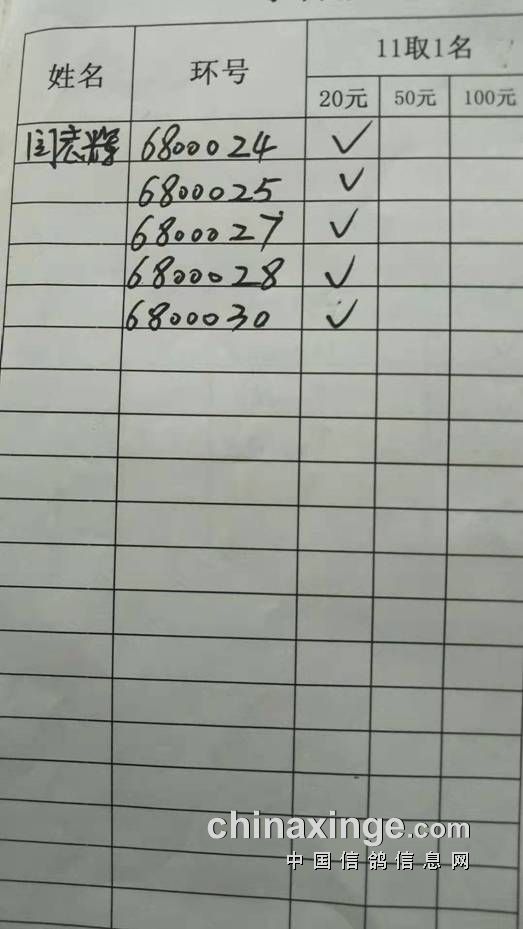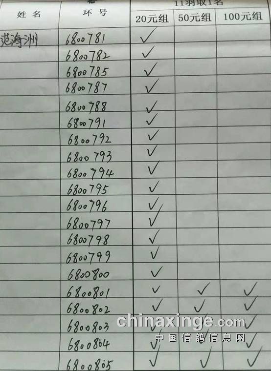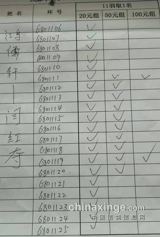 100元组共指定50羽,取前5名,冠军—4名各1000元,5名540元