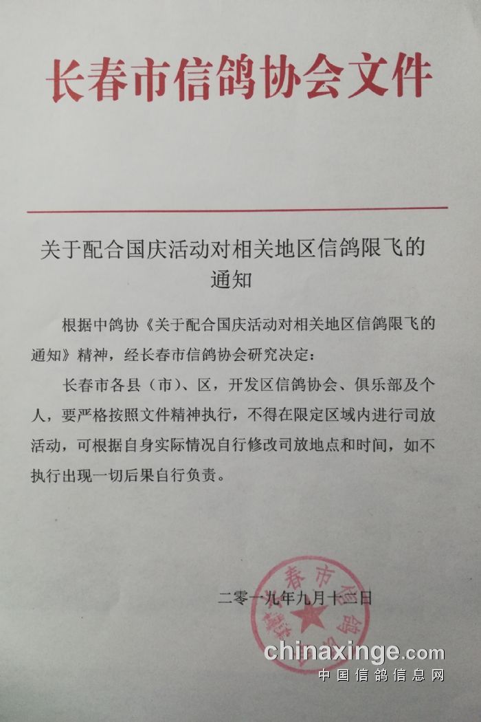 关于配合国庆活动对相关地区信鸽限飞的通知