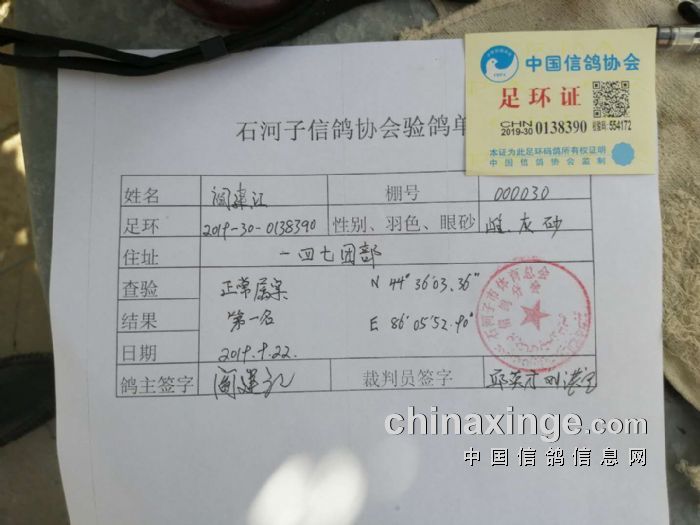 石河子信鸽协会2019秋季四关赛第一关300公里前三名验鸽照片