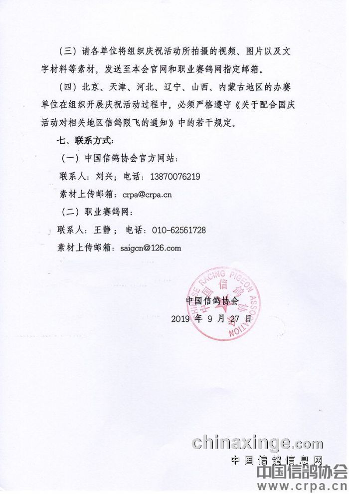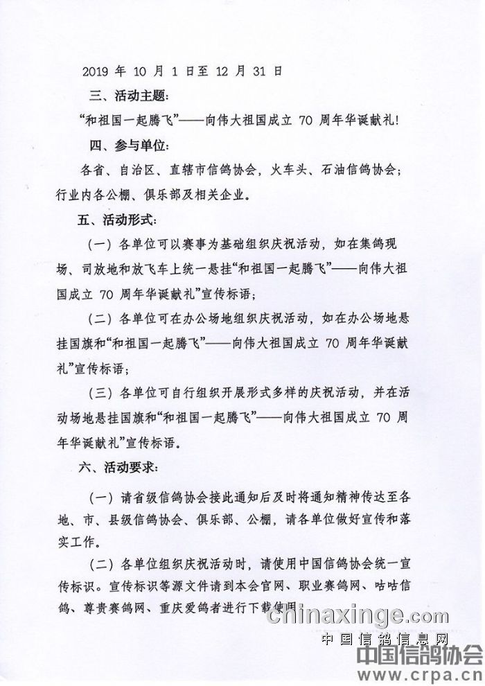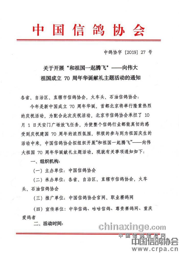 转发中国信鸽协会关于开展“和祖国一起腾飞”—向伟大祖国成立70周年华诞献礼主题活动的通知