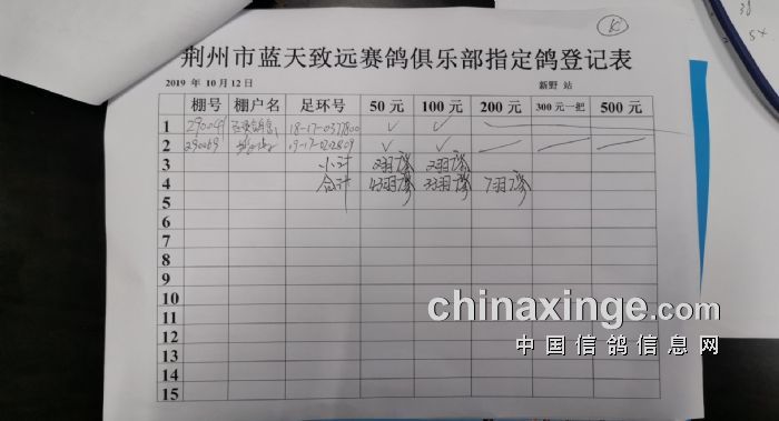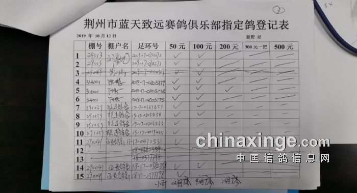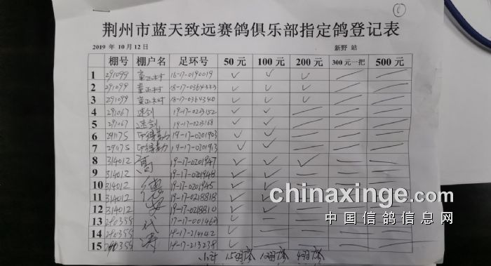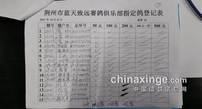 2019年秋10月12日260公里新野站比赛集鸽清单指定鸽明细