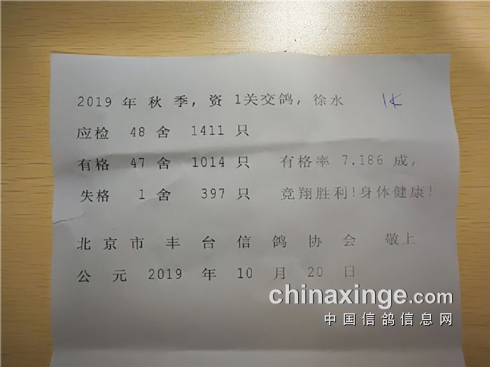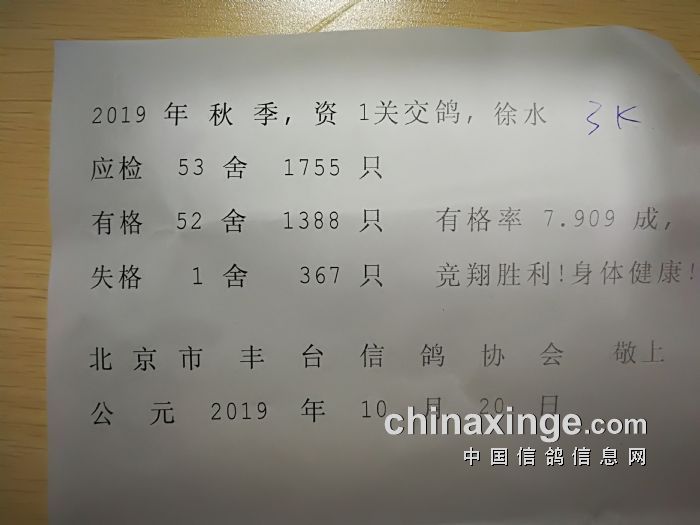 丰台鸽会2019年秋季1000、3000、元特比三关综合大奖赛