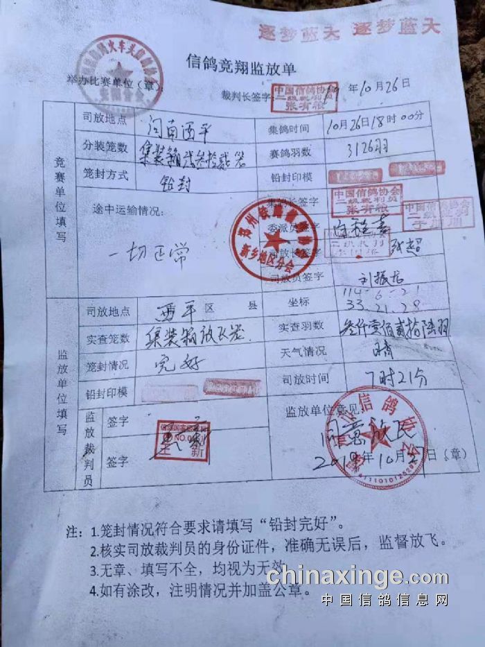 2019年秋季第一关300公里西平站今早7:21分开笼,距鸽会约301公里,司放地天气晴,无风,赛鸽定向良好。各项比赛及指定数据已上网,会员可上网查看。请会员提前检测鸽种,另:名次录取完以后,由众康水饺坊赞助十名幸运奖,获奖价值55元代金券,名次挂六得奖,电子鸽钟属于电子产品,由于各种原因,随时都可能出现故障(如漏扫,不上传等现象),你在自愿购买时必须有所准备,集鸽前做好电子环,上传电话卡的检测(最好使用中国移动卡并开通GPRS功能),确保卡内话费余额充足,赛时尽早使鸽钟通电以免操作匆忙导致卫星定位及校时不准而致上传失误。个人操作失误致数据不准或不上传数据者,造成赛鸽无成绩协会概不负责。预祝参赛鸽友赛出好成绩。