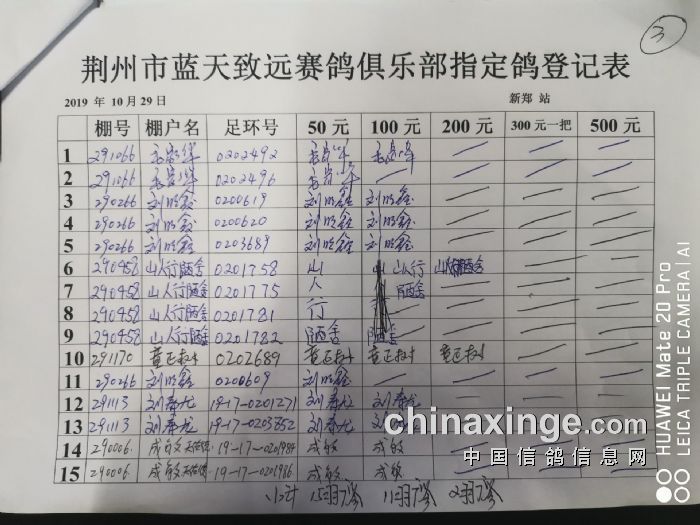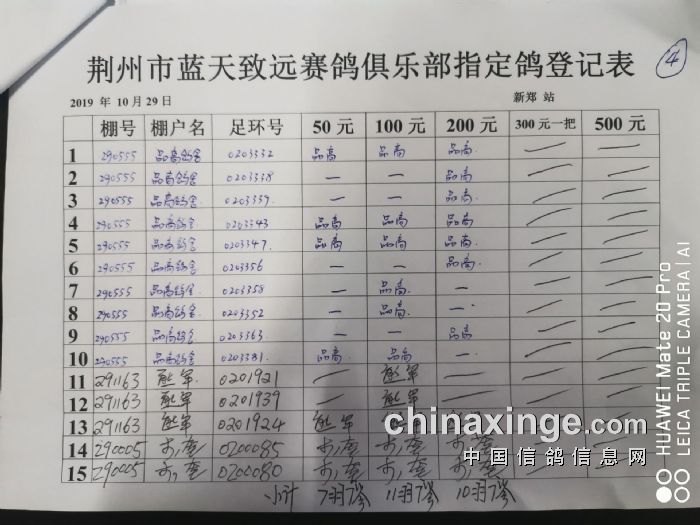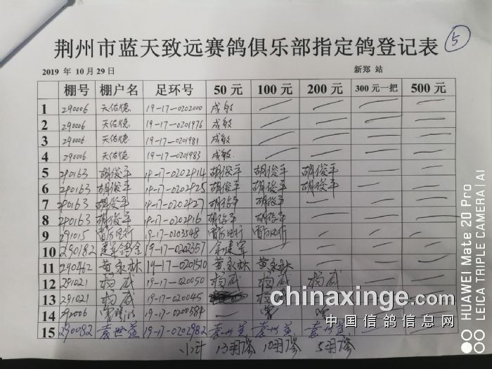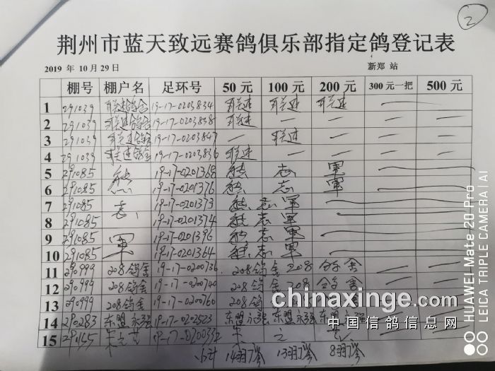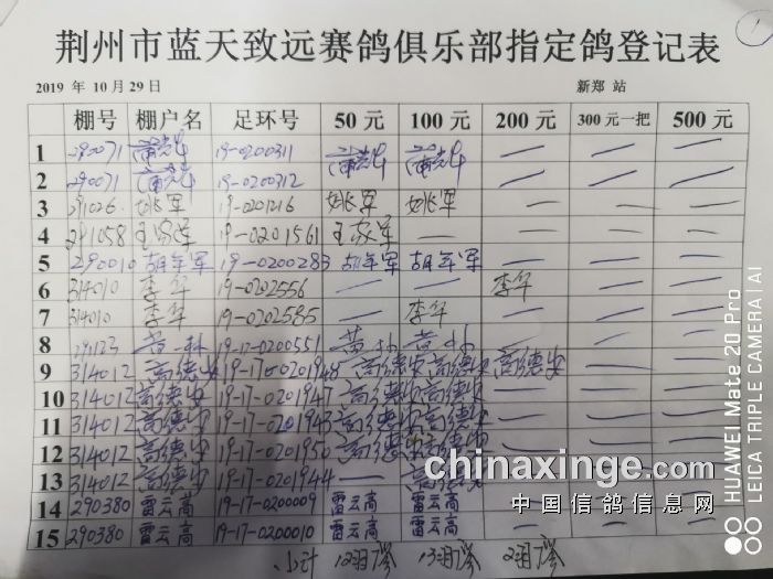 2019年秋10月29日神通杯100元特比环第二关新郑站比赛指定鸽明细