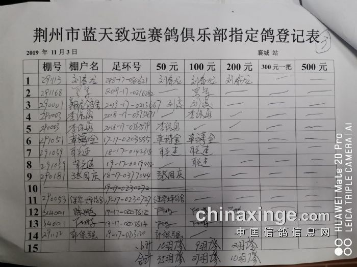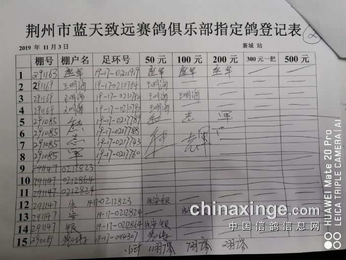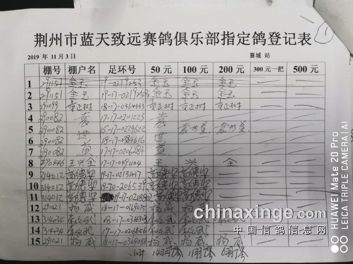 2019年秋11月3日400公里襄城站比赛指定鸽明细