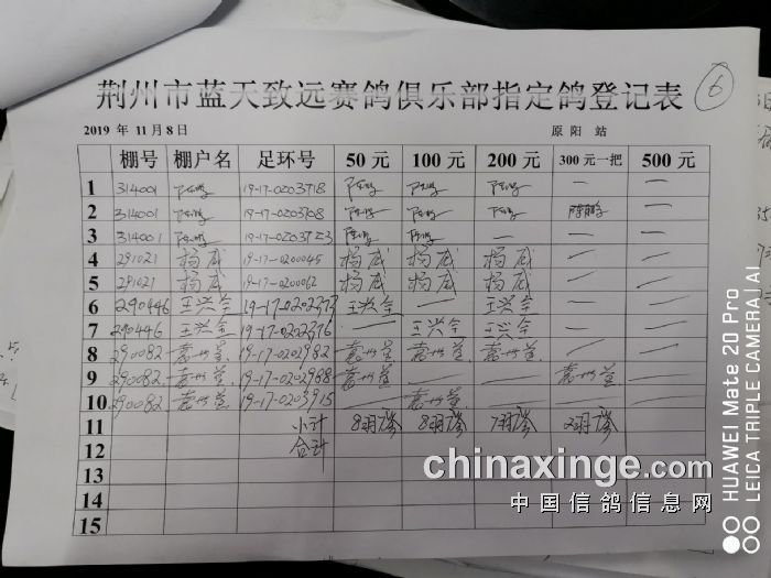2019年秋11月8日神通杯100元特比环第三关原阳站比赛指定鸽明细