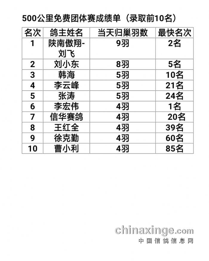 500公里免费团体赛成绩单(录取前10名)