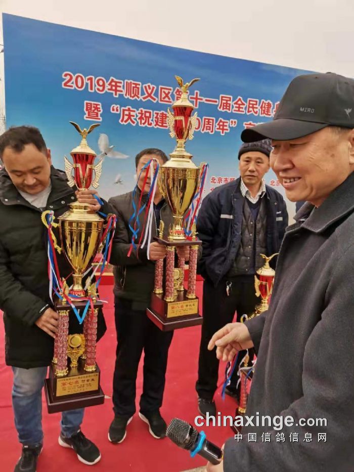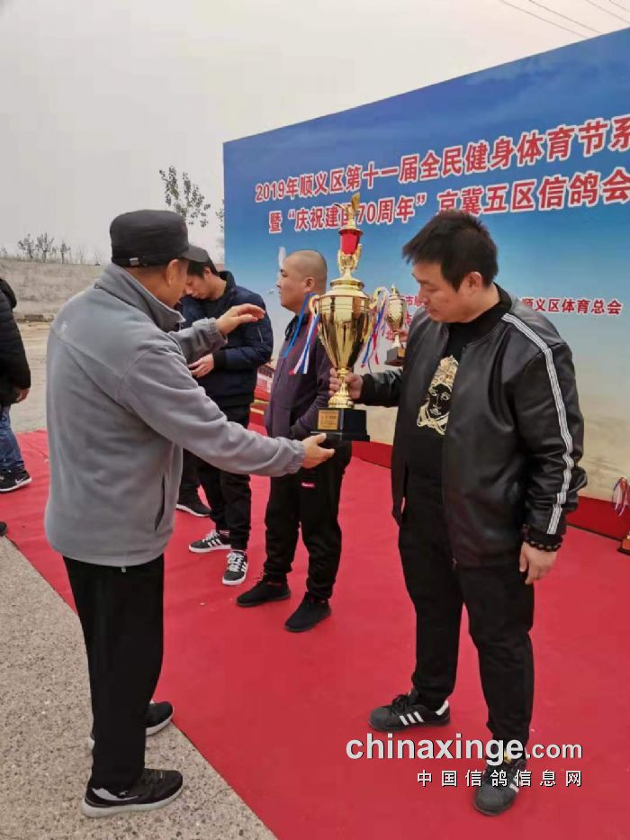 颁奖开始了,体育局领导为获奖鸽友颁发奖杯