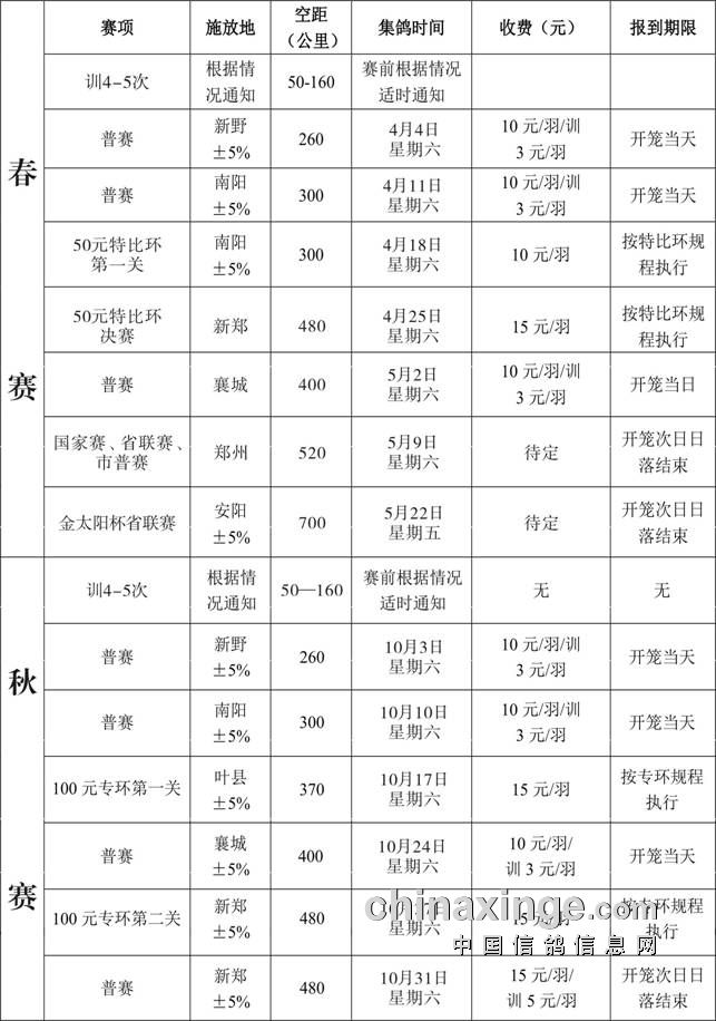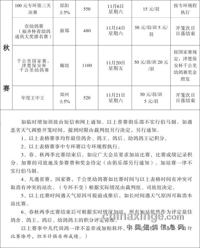 1、竞赛项目:普赛及专环,幼鸽赛、王中王赛、省联赛、国家赛等。2、竞赛时间表 以下表格中所有规定的时间统一为暂定时间,俱乐部可根据天气原因和其它因素随