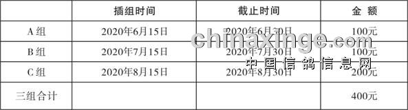 1、本次三关鸽王插组结合本地情况采取一插到底方式,分为 A组100、B组100元、 C组200元三个时间阶段插组,具体及具体交费金额详见下表