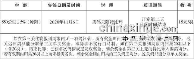 7、当遇恶劣气候时,集鸽时间提前或顺延。若受禽流感或其它不可抗力因素干扰时,集鸽延