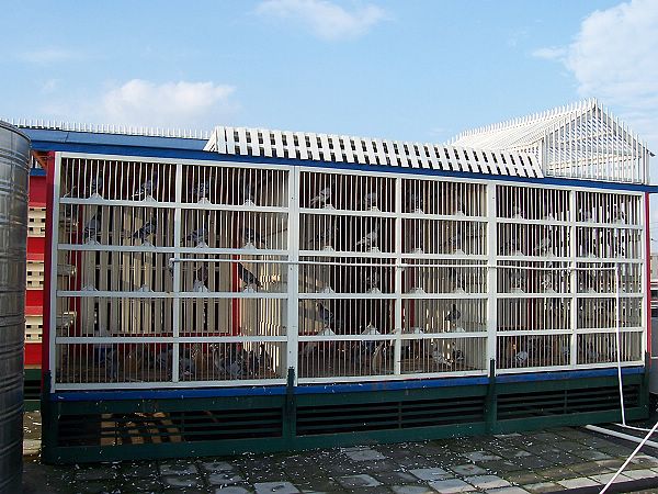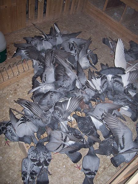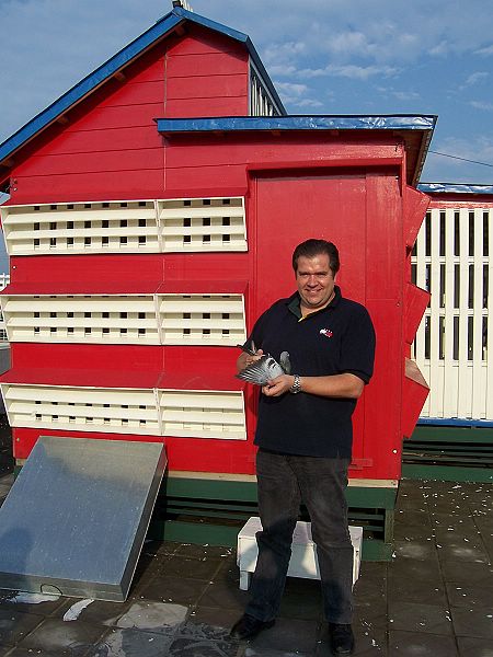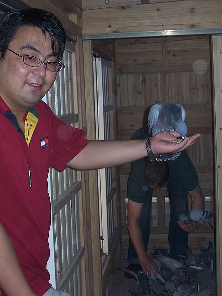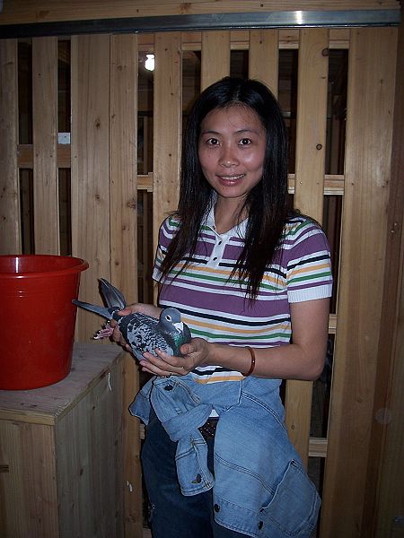 作为特地上门取经学习,我们尽力注意寻找彼此管理操作的不同点。唐小姐介绍罗伯特养鸽比较崇尚自然,开舍以来基本未用过药物,她说如果连一些小毛病都不能抗过,这种鸽子还是早点淘汰为好,她说罗伯特平时也经常杀鸽,为的是确保鸽群的质量;另外,罗伯特在配种上喜欢采用大雄配小雌(无论是年龄还是体型);还有鸽舍外观显得有点特别,它采用了一般鸽友不肯用的“消防红色”,显得十分扎眼,不知纯属巧合,还是由于罗伯特的棚号是119,故意选用了红色!唐小姐讲了其实鸽子对红色并无太大的感受,只是习惯便成了自然;我们还发现他们进入鸽舍,并未是原先想象的要穿上专用的大褂,显得比较随便;再有他们的幼鸽一点也不怕人,性格与外国鸽友一样的奔放;在经过强化飞行训练后(约飞1个小时左右,5月份入棚的鸽子已有状态,自行飞出不见,约有40分钟后回来;7月份入棚的鸽子,由于毛羽缺少,比较懒飞,需要专人赶飞),罗伯特还专门训练它们,即吹哨后20秒钟内能全部进舍吃食,起先我们还持有怀疑的态度,结果却让我们信服了!只听哨声一响,鸽群争先恐后、饿虎扑食般的进舍吃食,它们全然不顾穿着红绿衣服的生人,猛吃海喝,给食整整持续了约15分钟,食料吃得很好,是凡赛尔品牌饲料,此时可以想象得出来,鸽儿们一定是个个吃得肚膨腹饱!真是荷兰的鸽子荷兰人调教,管理严格、手法独特!绝对的饥饿,强化的训练,残酷的淘汰,使鸽子自小形成一种固有的生活方式,这对今后比赛一定十分有益!对我们来讲,算是接受了一次新的理念灌输。