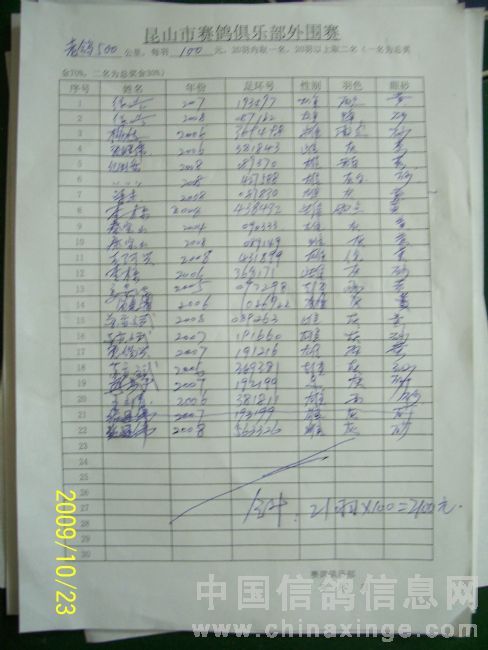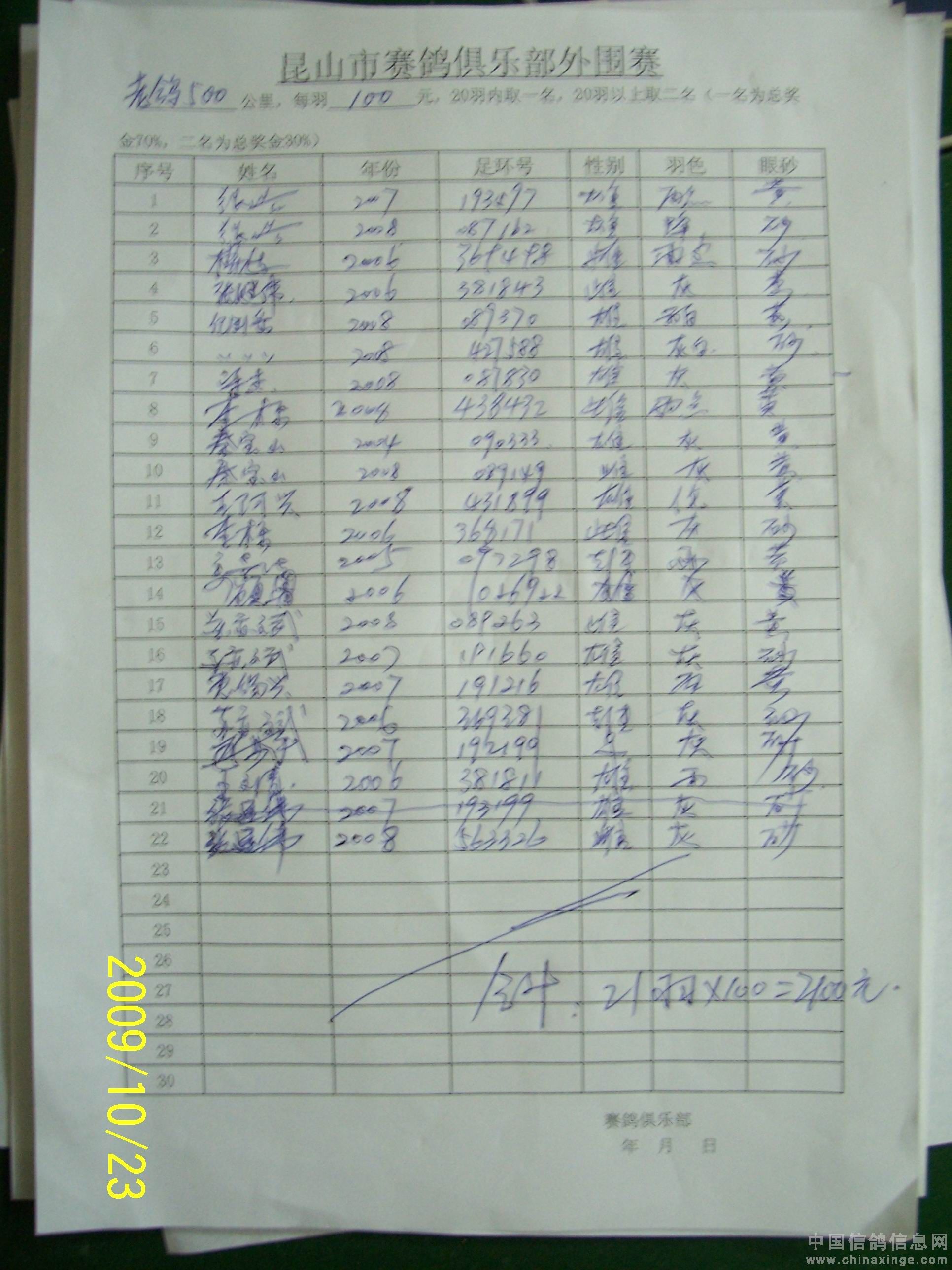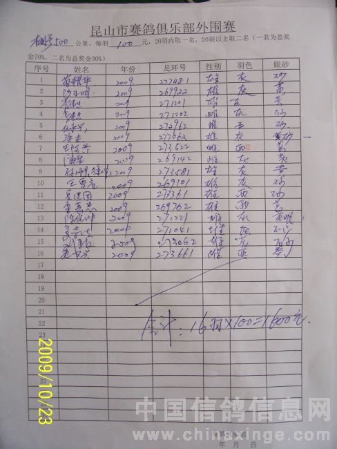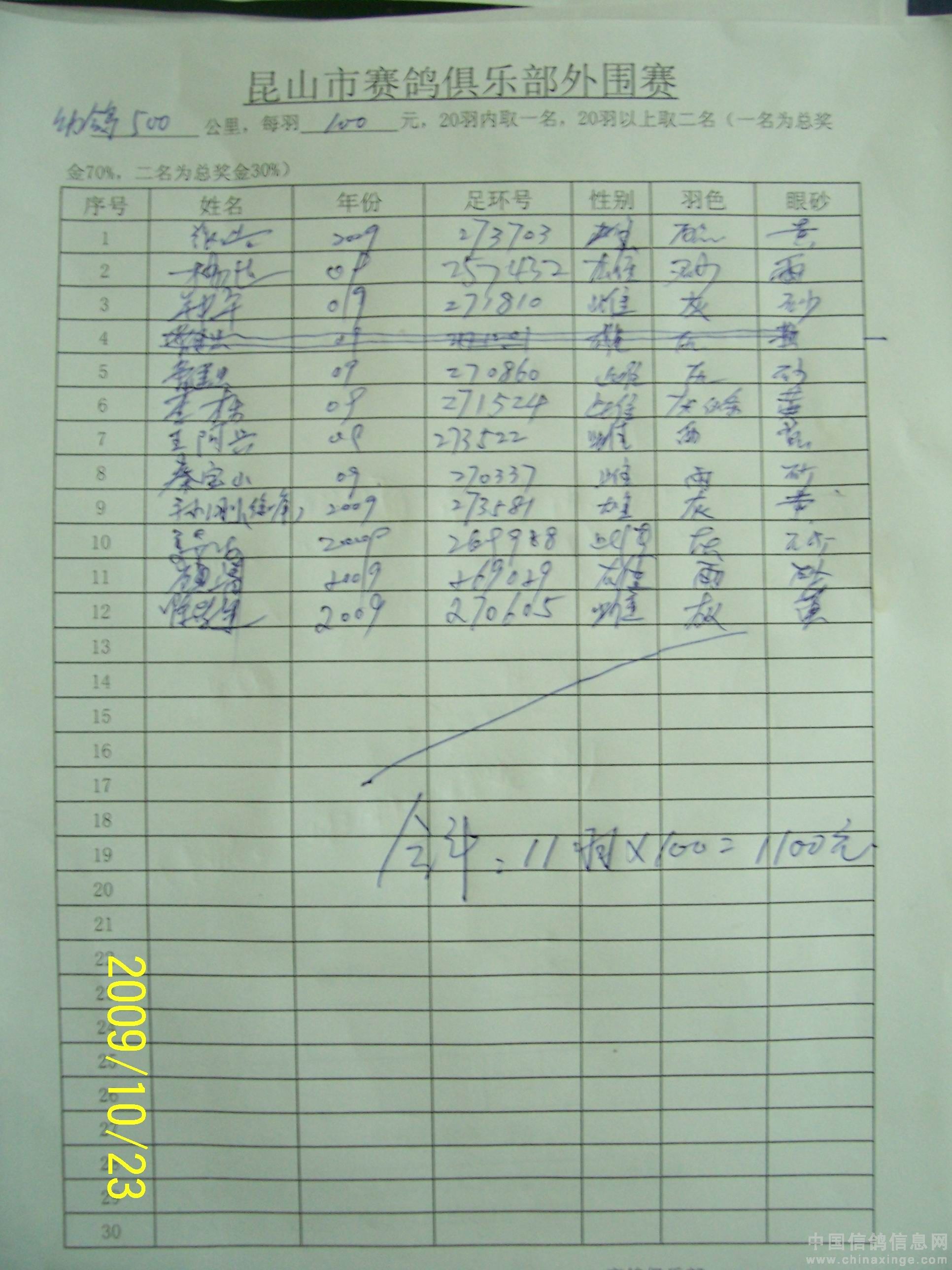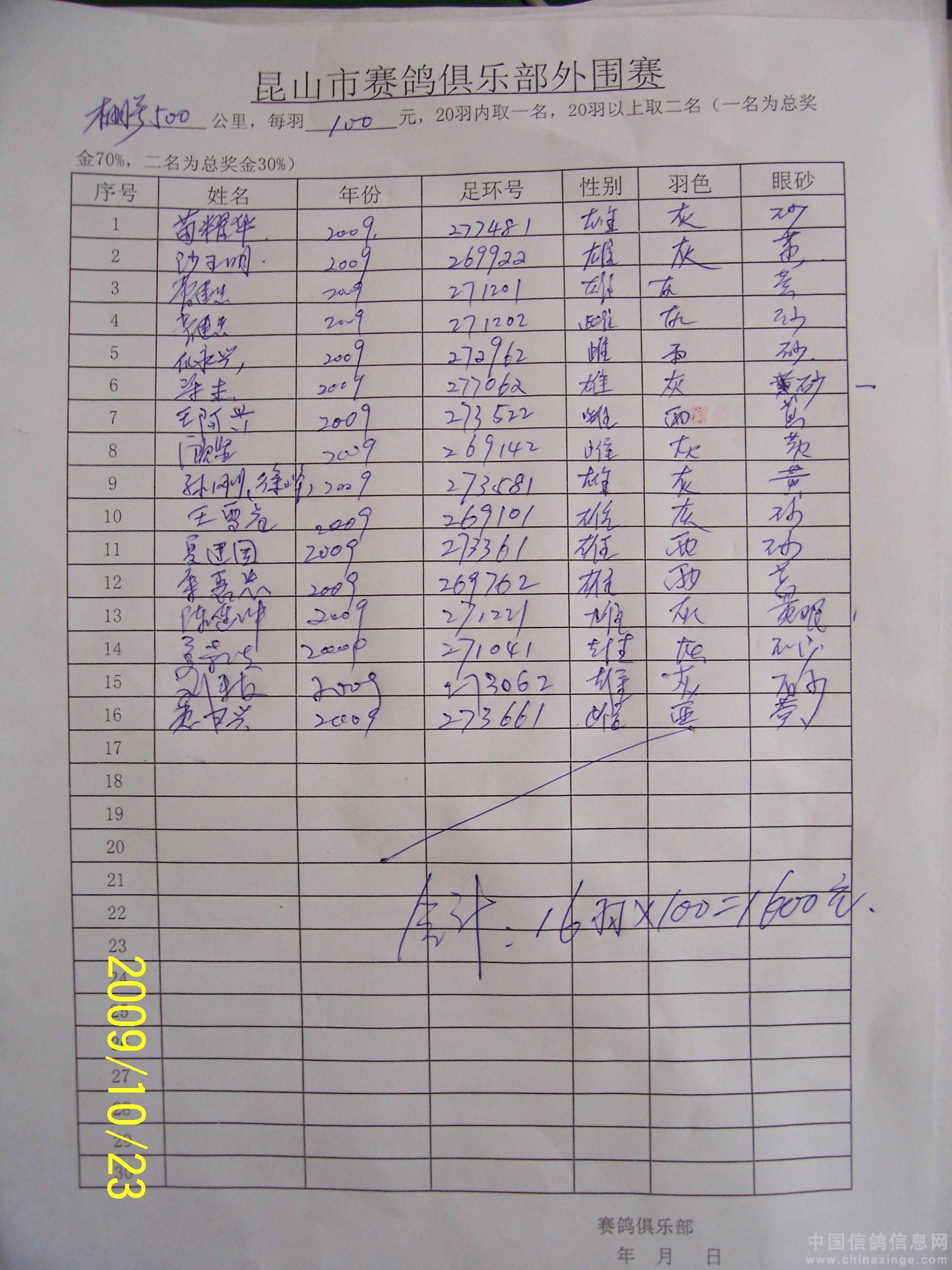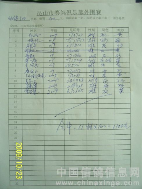 注:另增补表外参赛者一人 高 伟 2009-269753 雄、灰、黄眼,总计12羽,收费1200元。