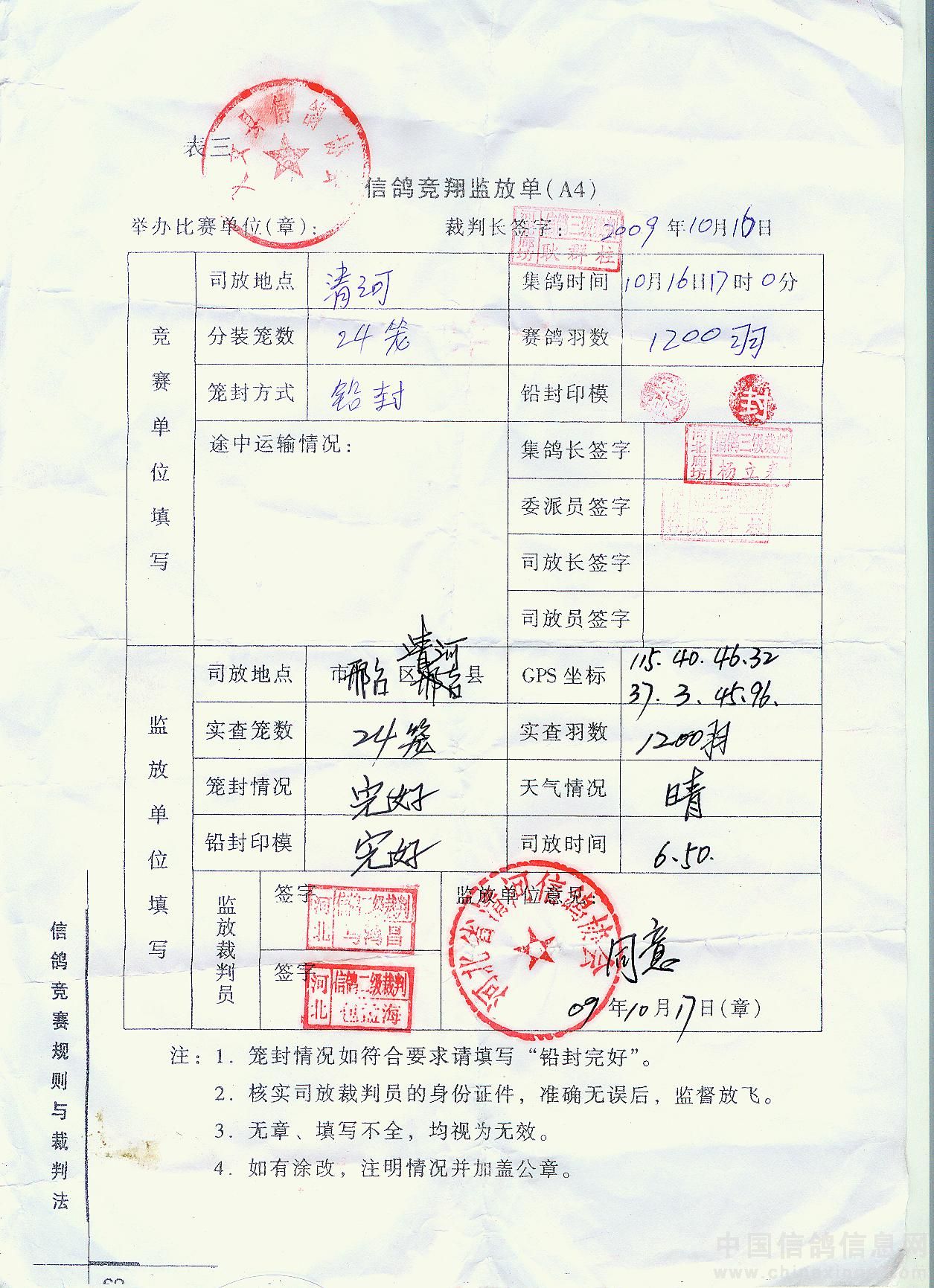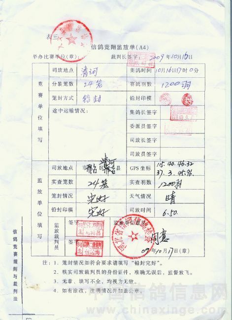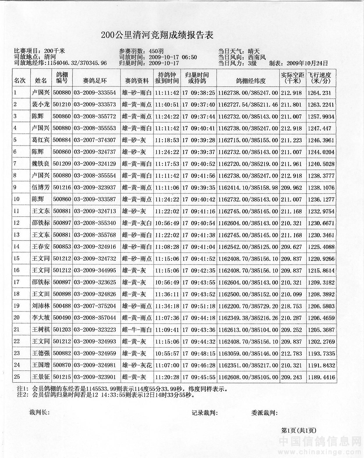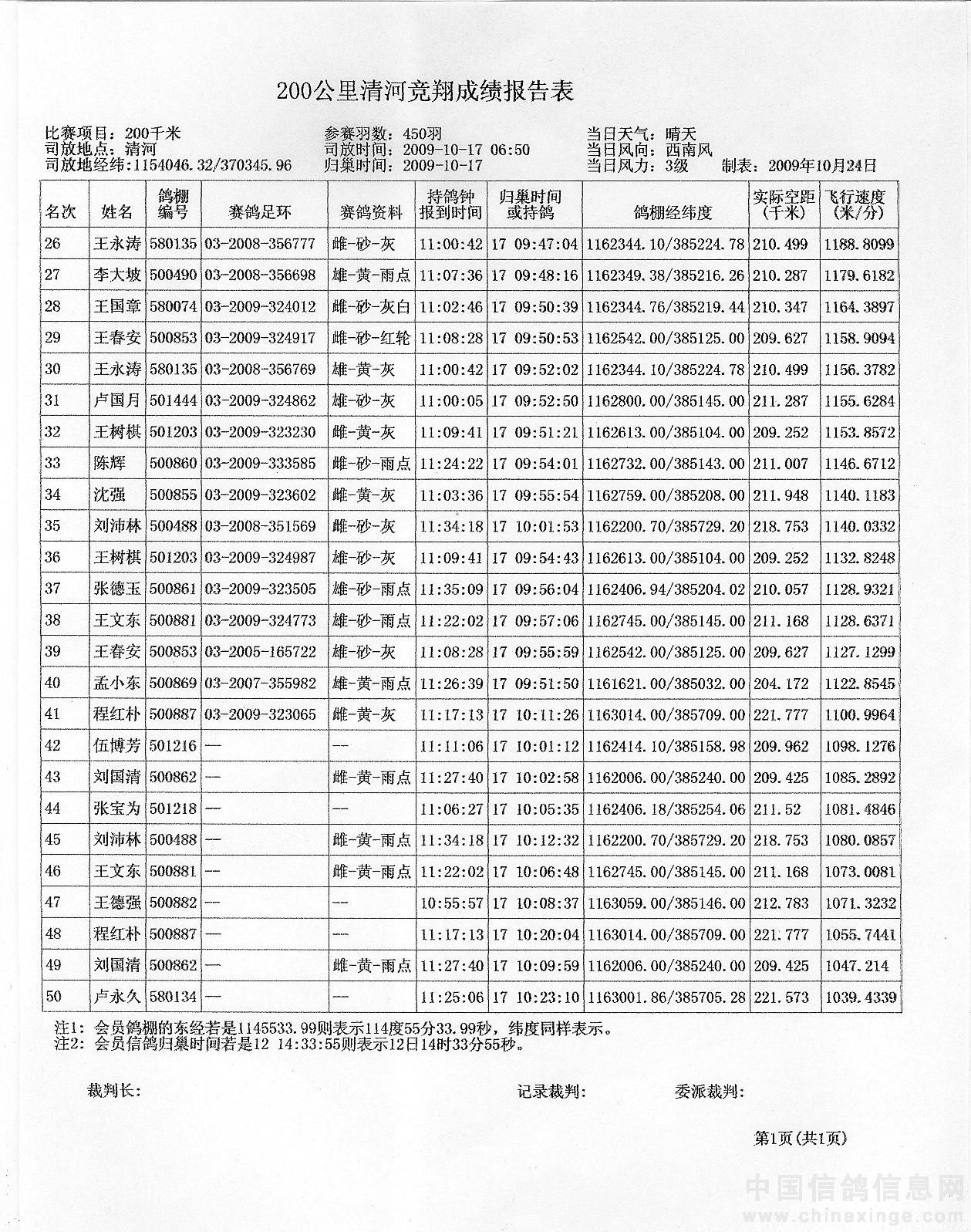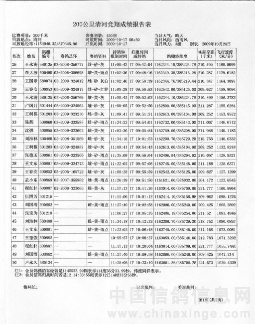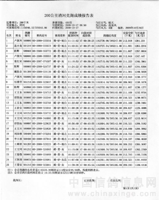 2009年秋季200公里清河竞翔成绩报告单