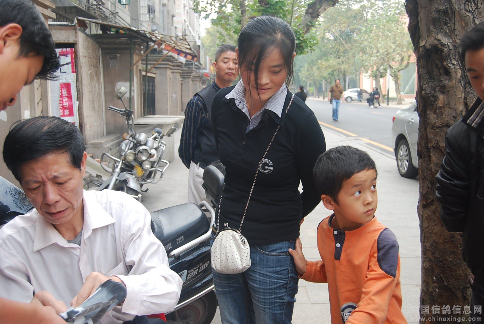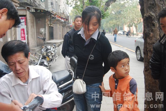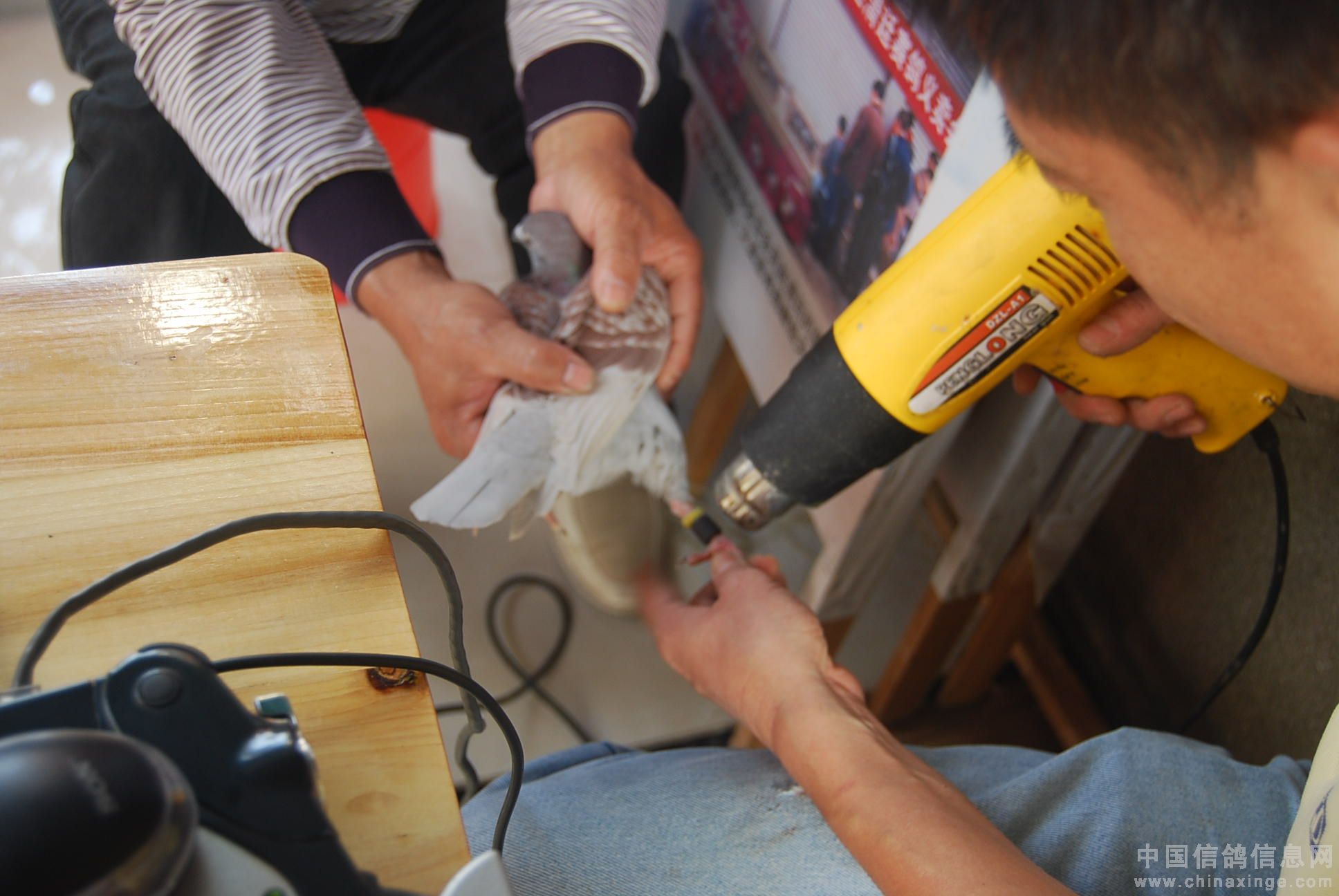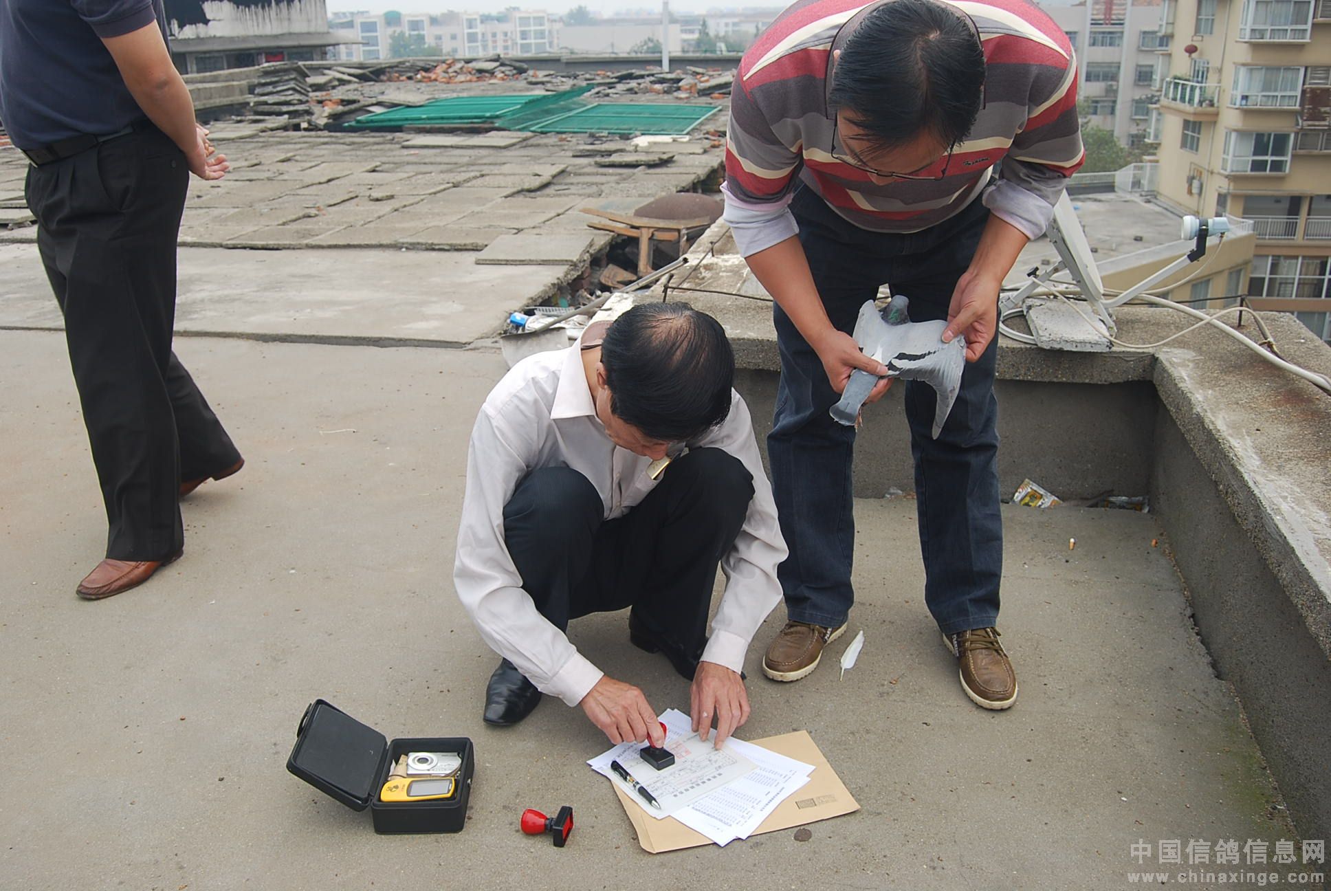 获奖鸽主袁国夫的夫人和儿子送鸽查验。