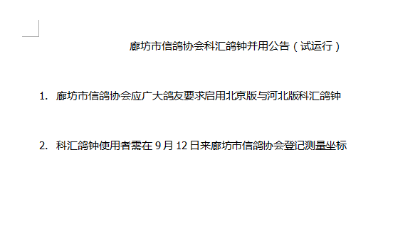 廊坊市信鸽协会科汇鸽钟并用公告(试运行)