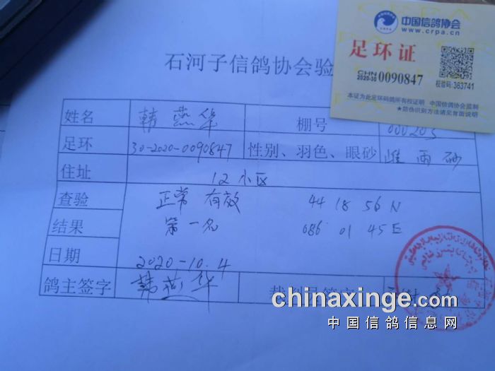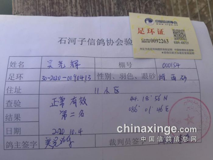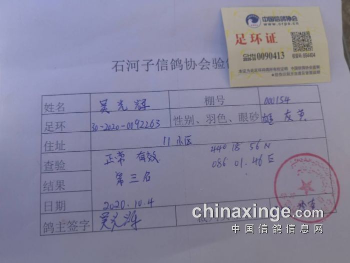 石河子信鸽协会2020秋季五关赛第三关400公里前三名