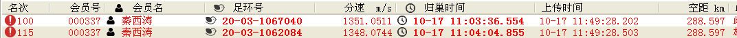 因秦西涛的赛鸽上传超时,故取消其100名,115名成绩,名次依次上移