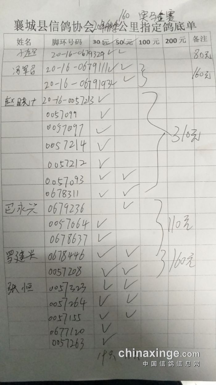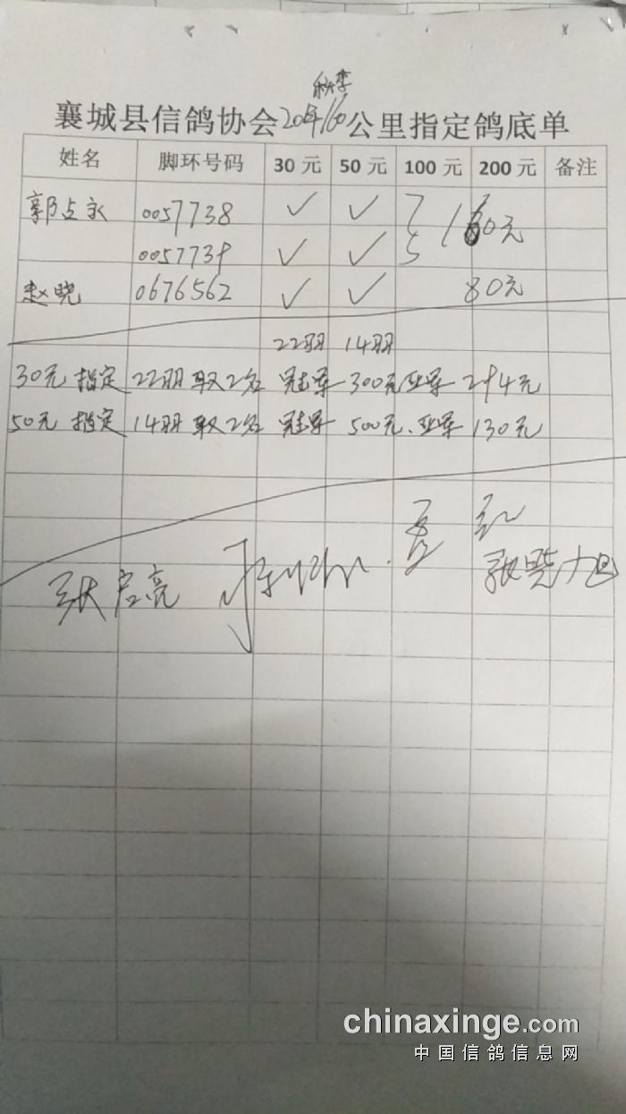 2020年秋季160公里 桐柏站实验赛指定鸽底单