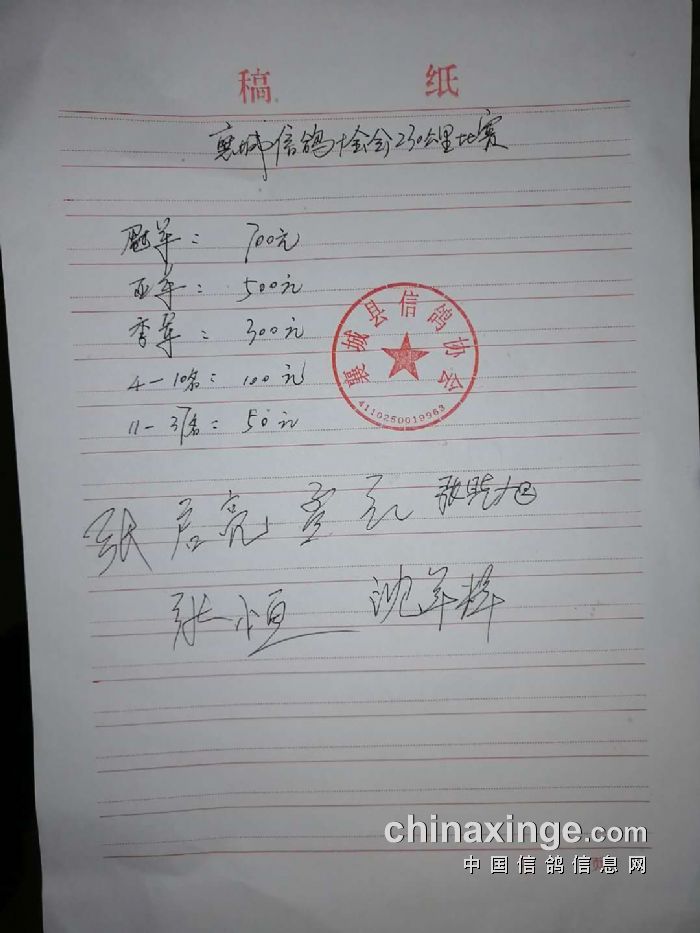 襄城县信鸽协会20年秋季230公里比赛录取名次及奖金分配