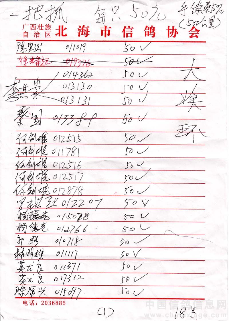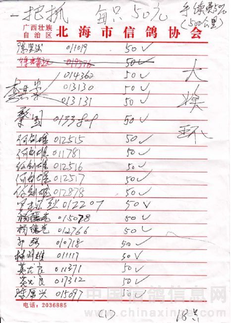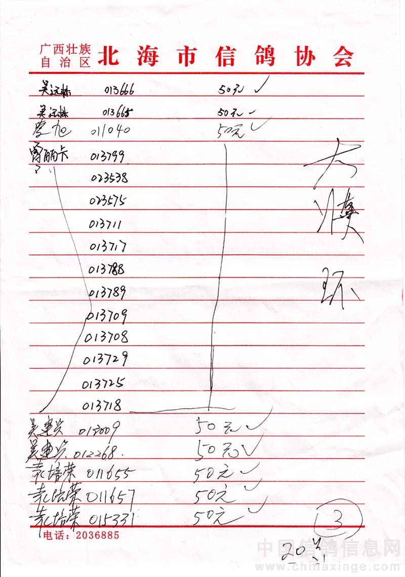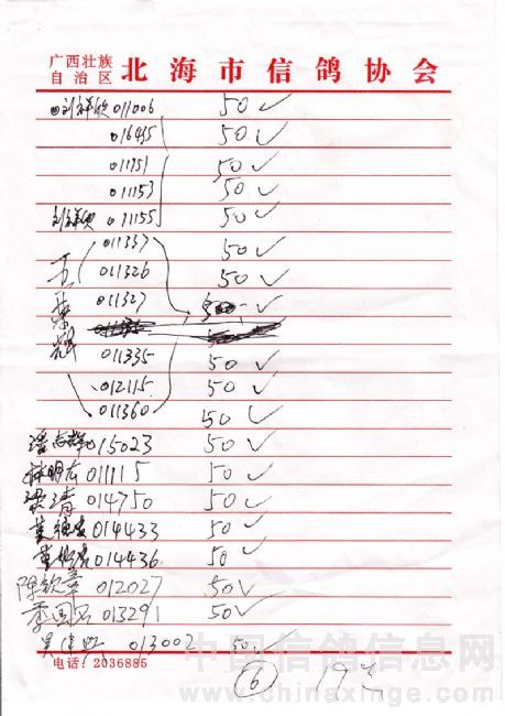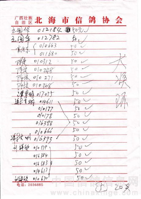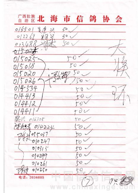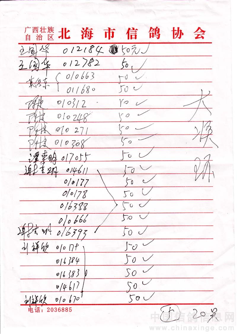 广西北海市信鸽协会2009年秋季东莞大奖(50元组)指定鸽名单