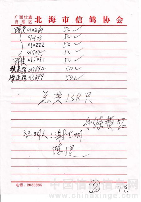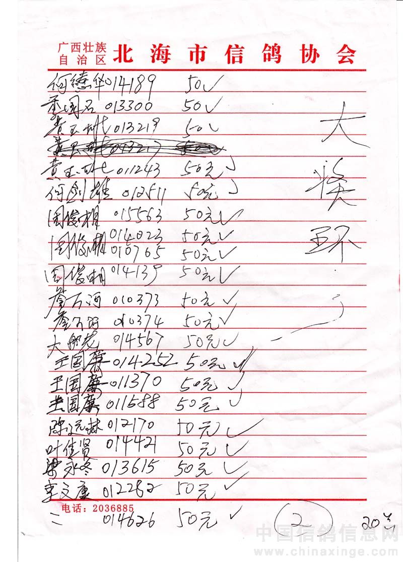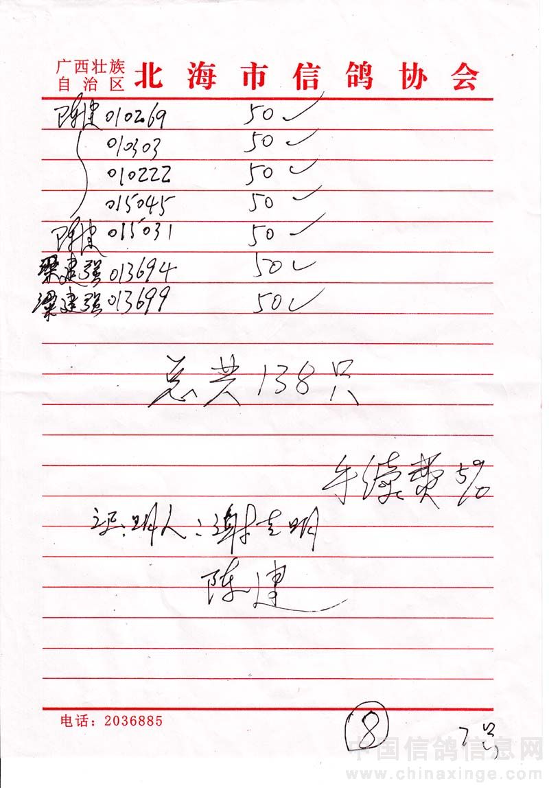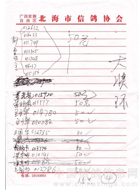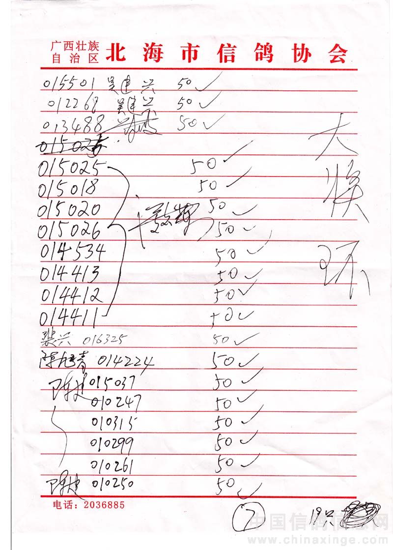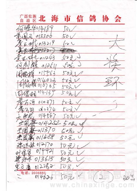 广西北海市信鸽协会2009年秋季东莞大奖(50元组)指定鸽名单