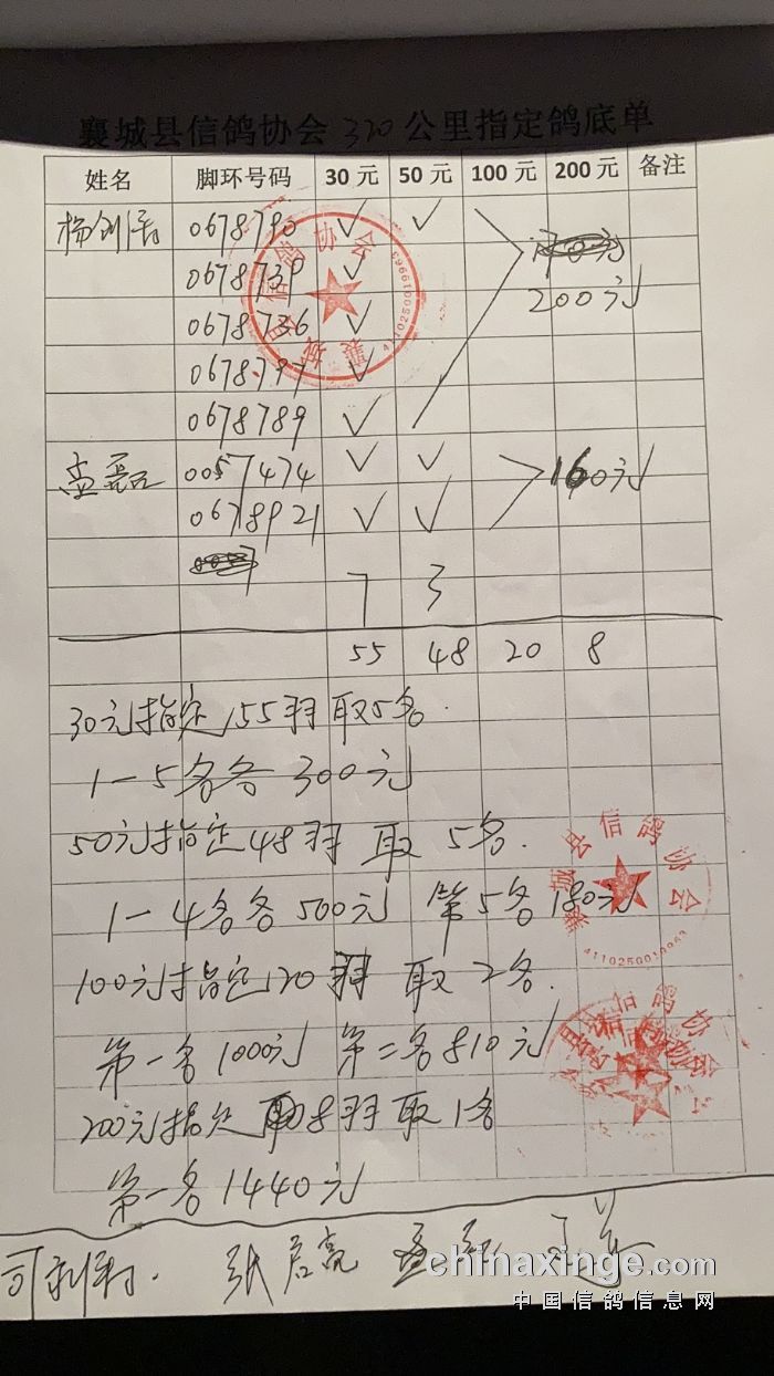 20年秋季320公里比赛指定鸽底单 录取名次及奖金分配