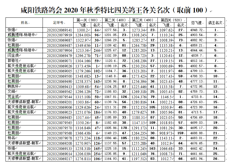 咸阳铁路信鸽协会2024年秋季第二关指定成绩