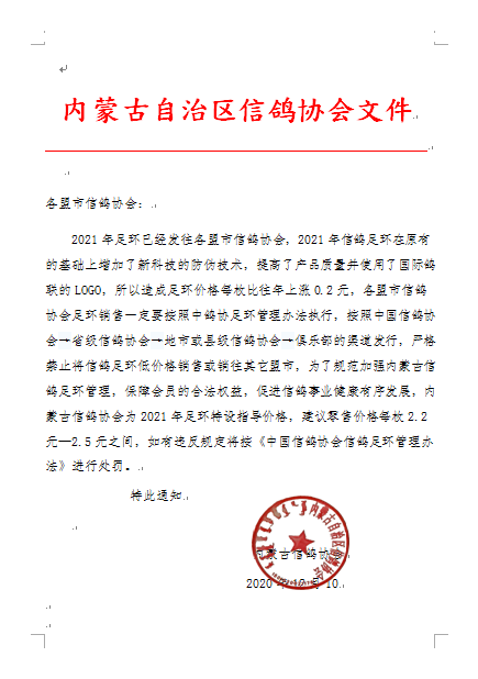 关于中国信鸽协会发行抗战胜利80周年纪念足环 内蒙古使用事宜的通知