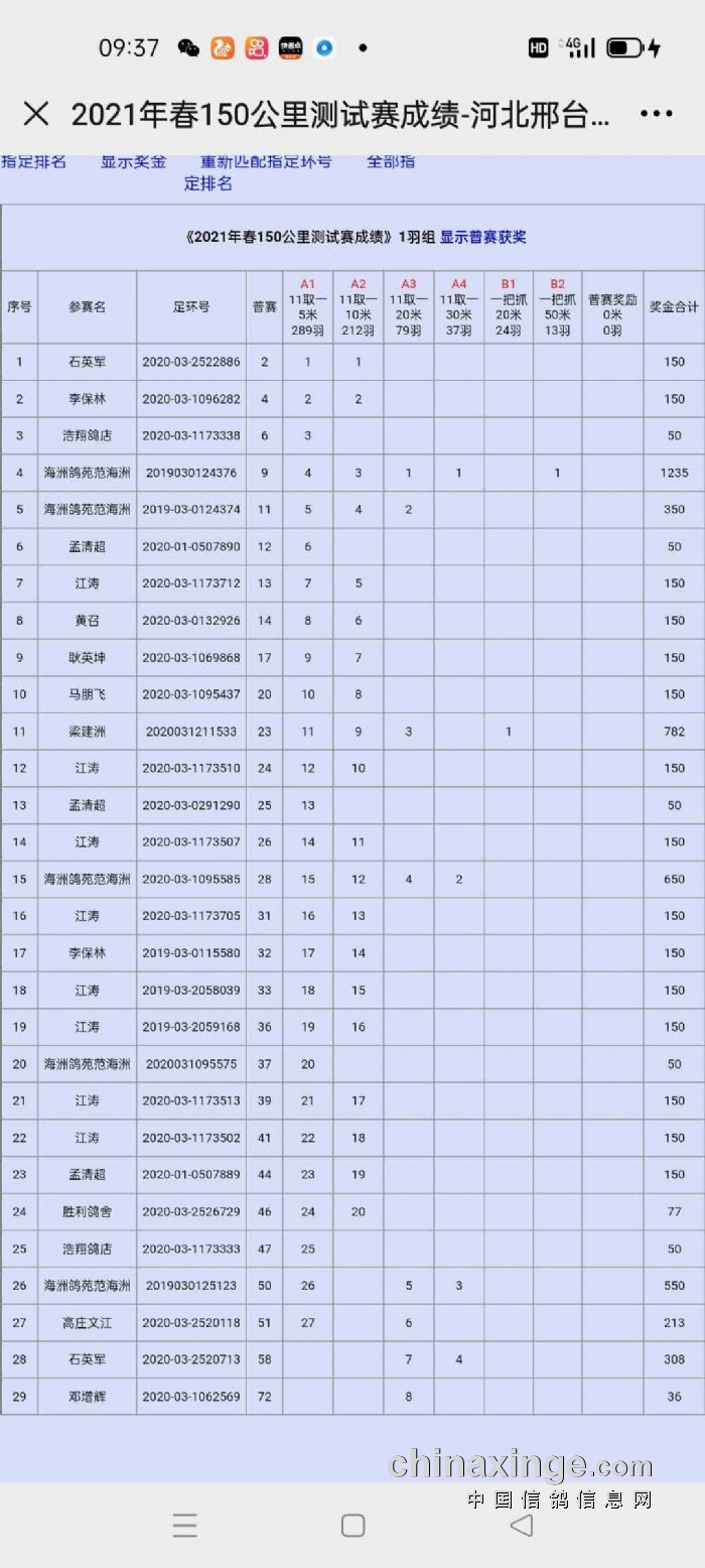 大曹庄鸽会150公里测试赛指定临时获奖成绩
