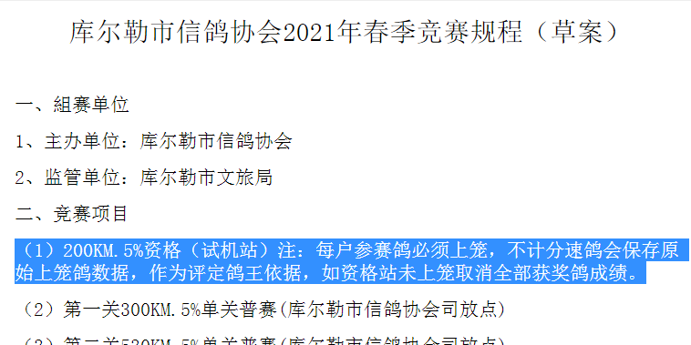 2021年春季200公里试机赛,所有参赛鸽必须上笼,不计分速,鸽会保存原始上笼鸽数据,作为评定鸽王依据,如资格站未上笼取消全部获奖鸽成绩。应鸽友要求,200公里试机站将加入指定鸽赛,望广大鸽友相互转告!!