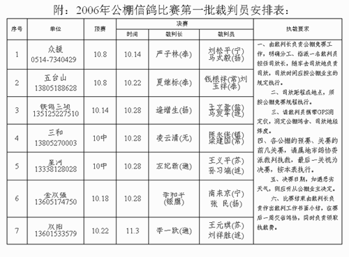 附:2006年公棚信鸽比赛第一批裁判员安排表: