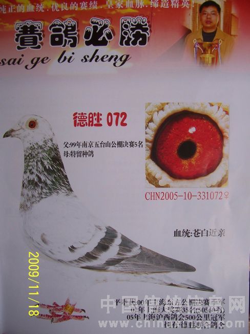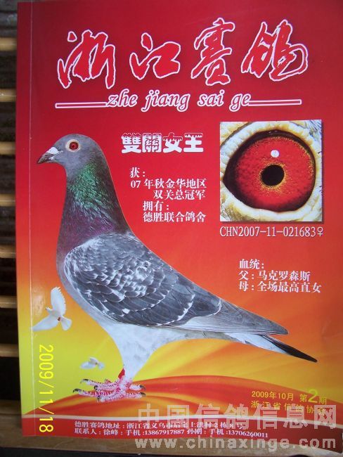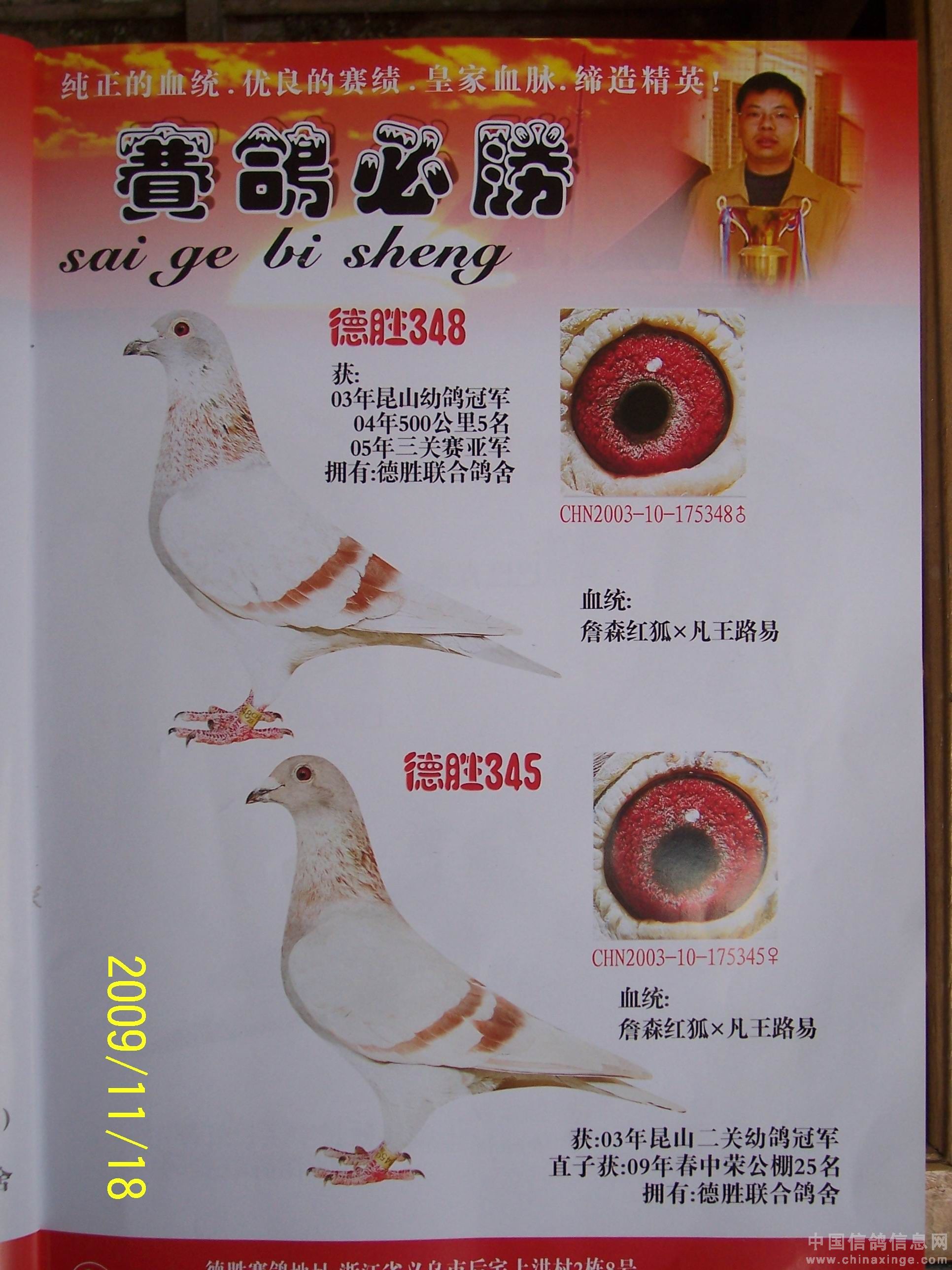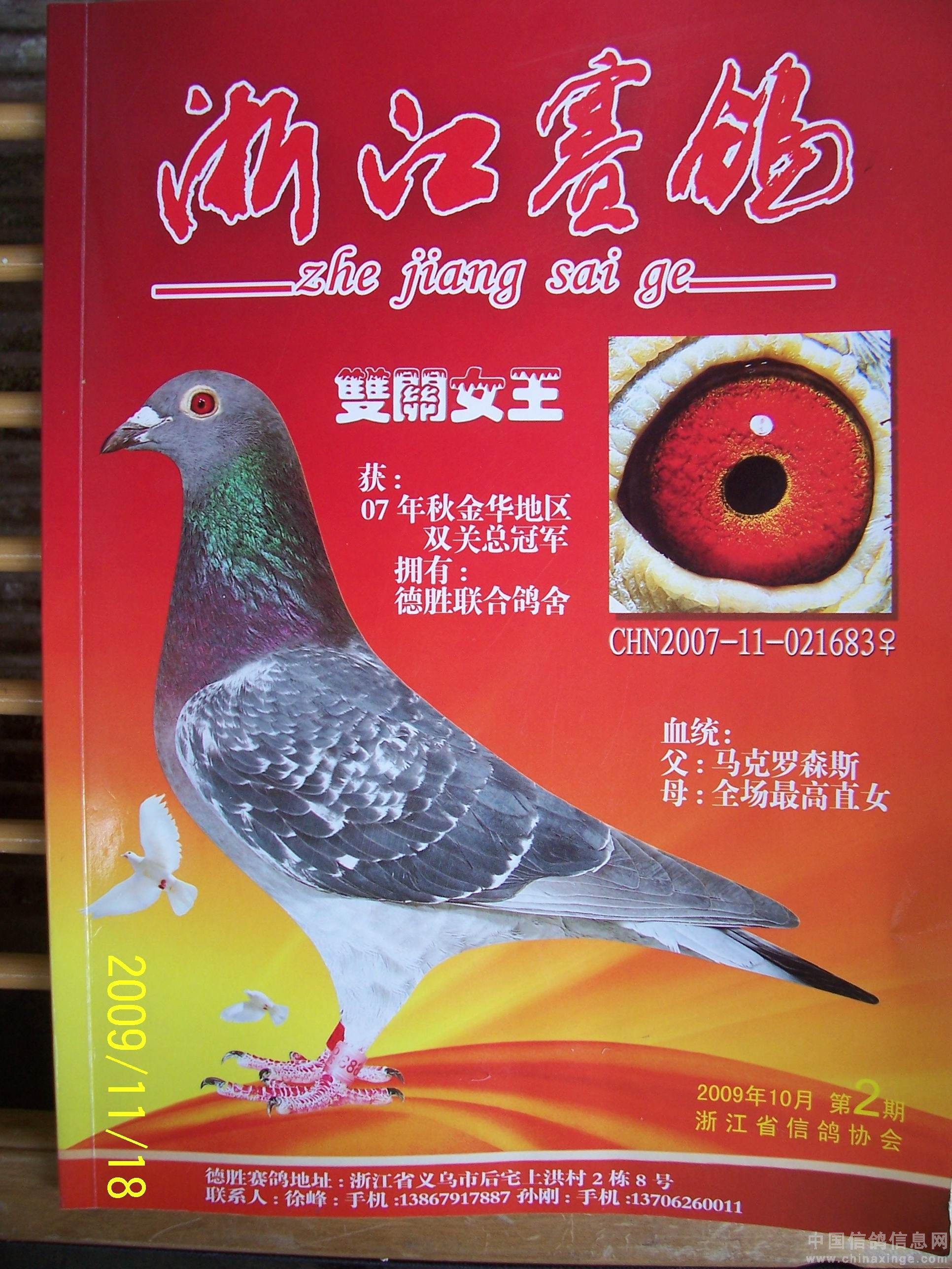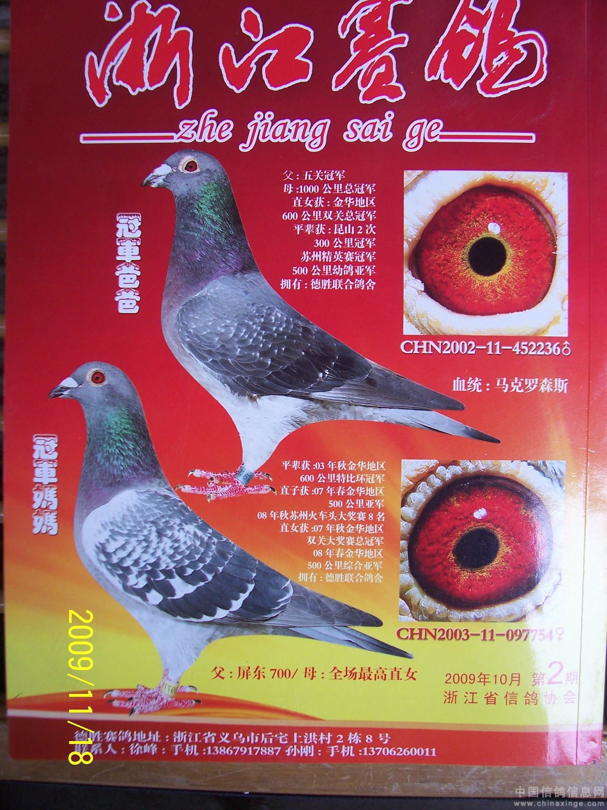 孙刚与徐峰两位鸽友合作建立的“德胜联合鸽舍”,是昆山鸽坛“股海”的一支“潜力股”,近年来,他俩不惜重金,广纳名鸽优种,今年秋季参赛即初见成效,投放幼鸽双关赛仅一羽鸽子,一举夺得了300/500公里幼鸽双关赛总冠军(详见鸽协成绩表,鸽主名为:徐峰)。现将他们于《浙江赛鸽》杂志上最新刊登的一些鸽照,推荐大家欣赏: